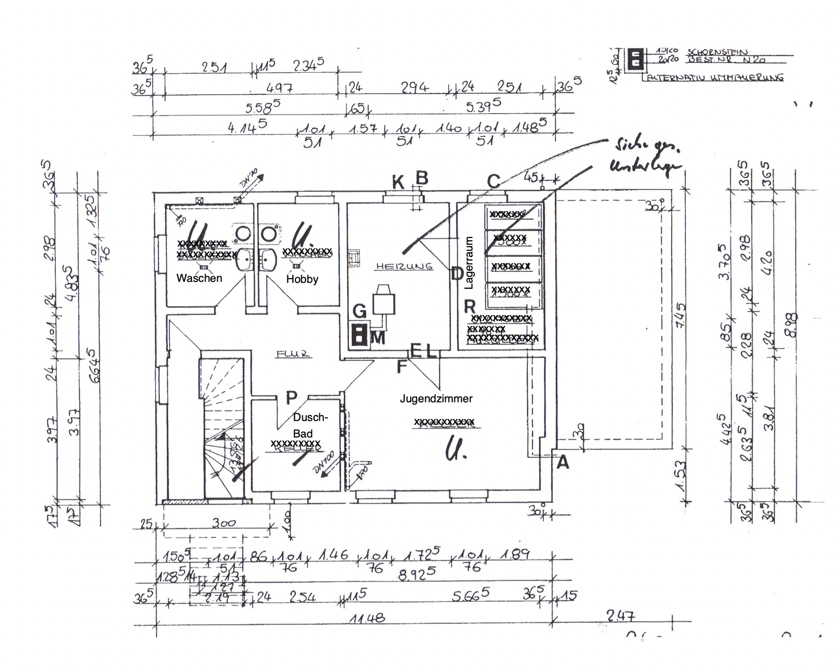 Im Keller befindet sich der Heizraum, eine geflieste Waschküche mit Fenster, ein Lagerraum und zwei zu Wohnzwecken ausgebaute Räume sowie ein Duschbad.