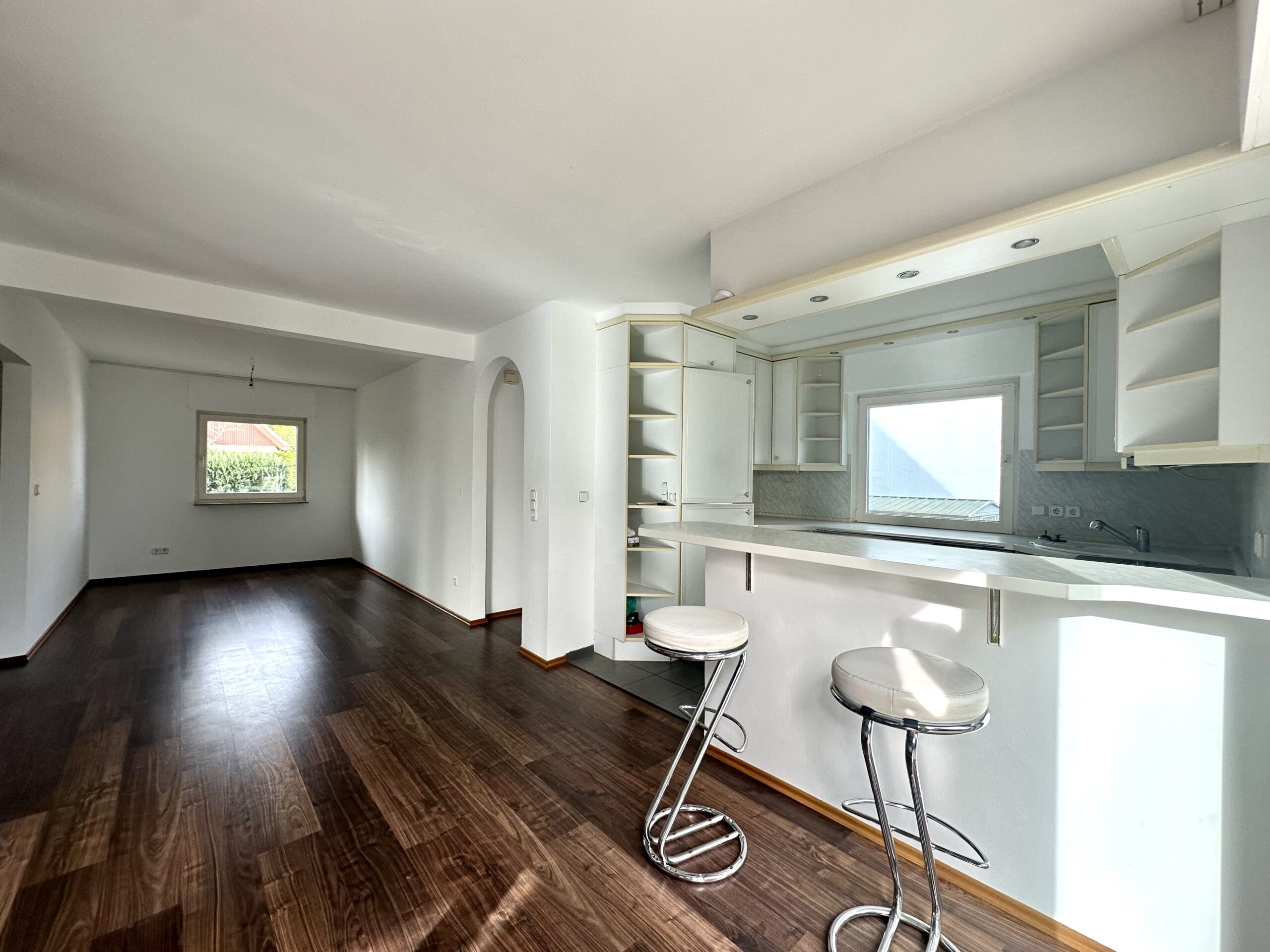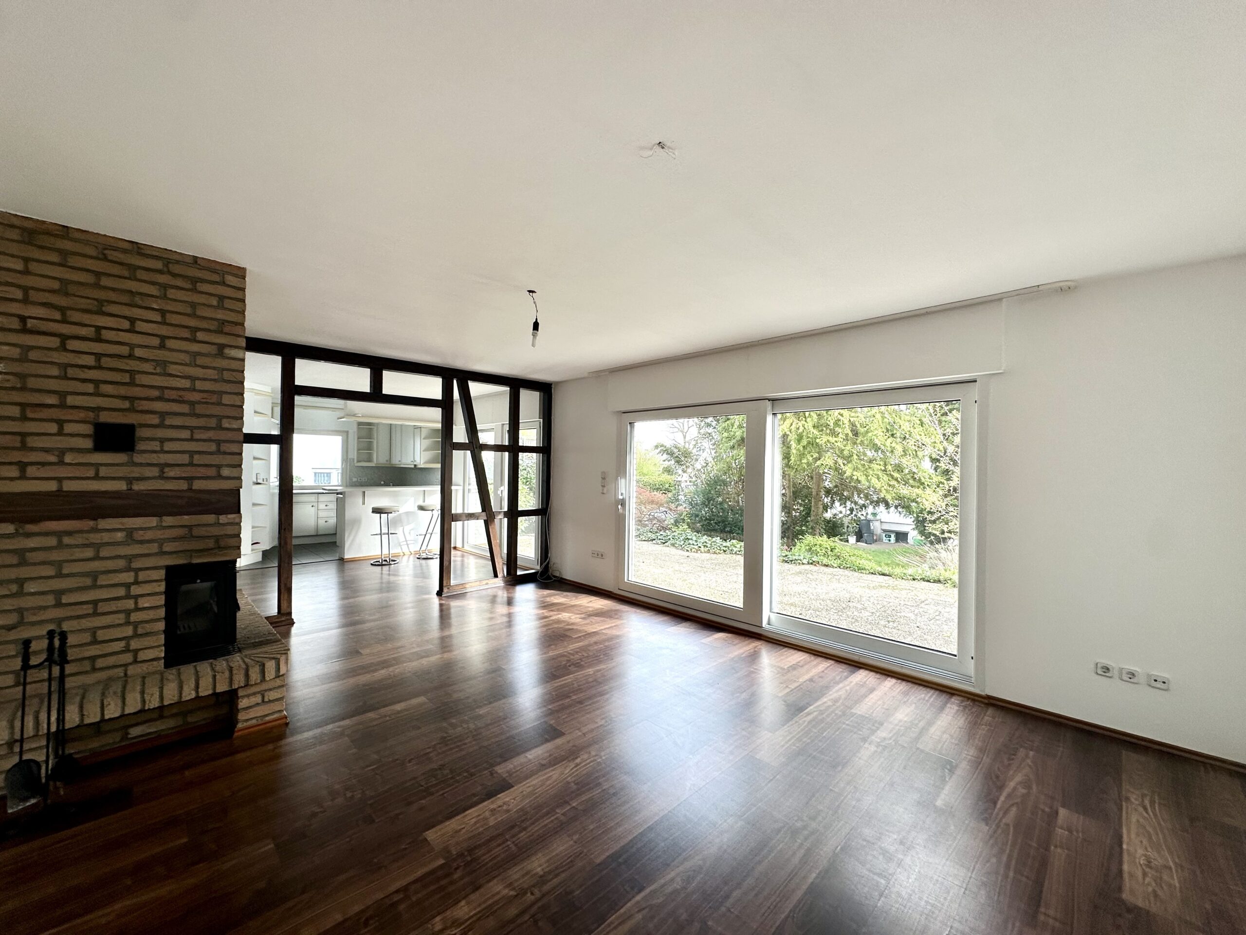 Der Wohn-, Ess- und Küchenbereich ist optisch getrennt und mit großzügigen Fensterflächen und einer großen Hebe-Schiebe-Tür mit Sicherheitsglas ausgestattet. Davor befindet sich die weitläufige Südterrasse mit Markise und Blick in den Garten. Das Wohnzimmer verfügt darüberhinaus über einen gemauerten Kamin, ausgestattet mit einer Kassette aus 2020. In Benutzung beheizt er das gesamte EG. Alle Fenster im Erdgeschoss sind mit Panzerrolläden ausgestattet.