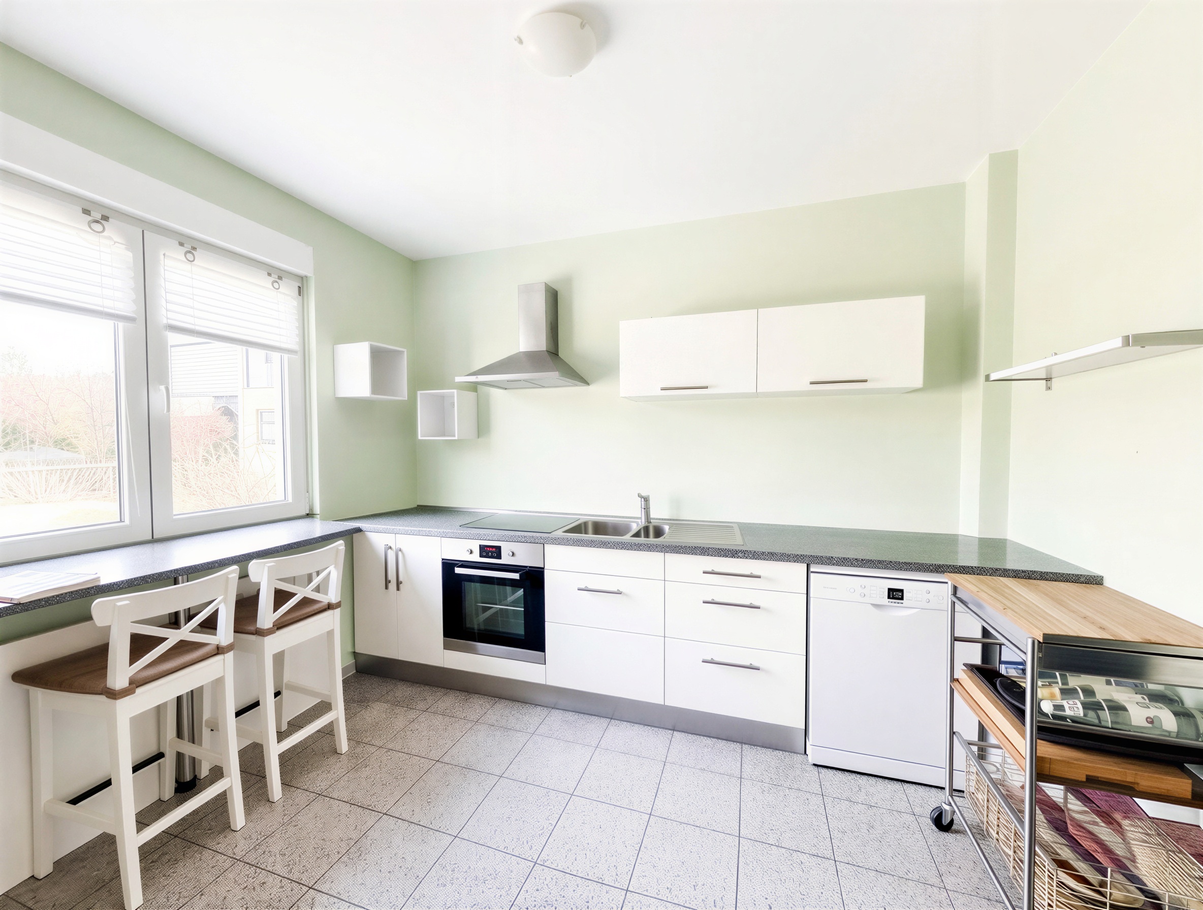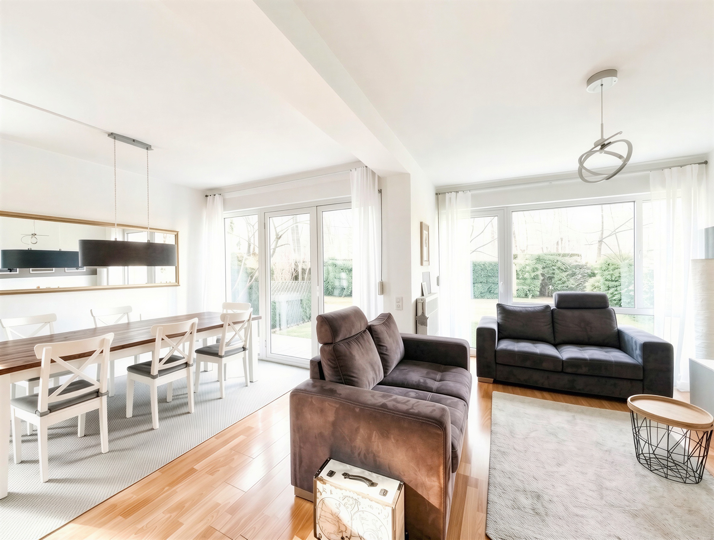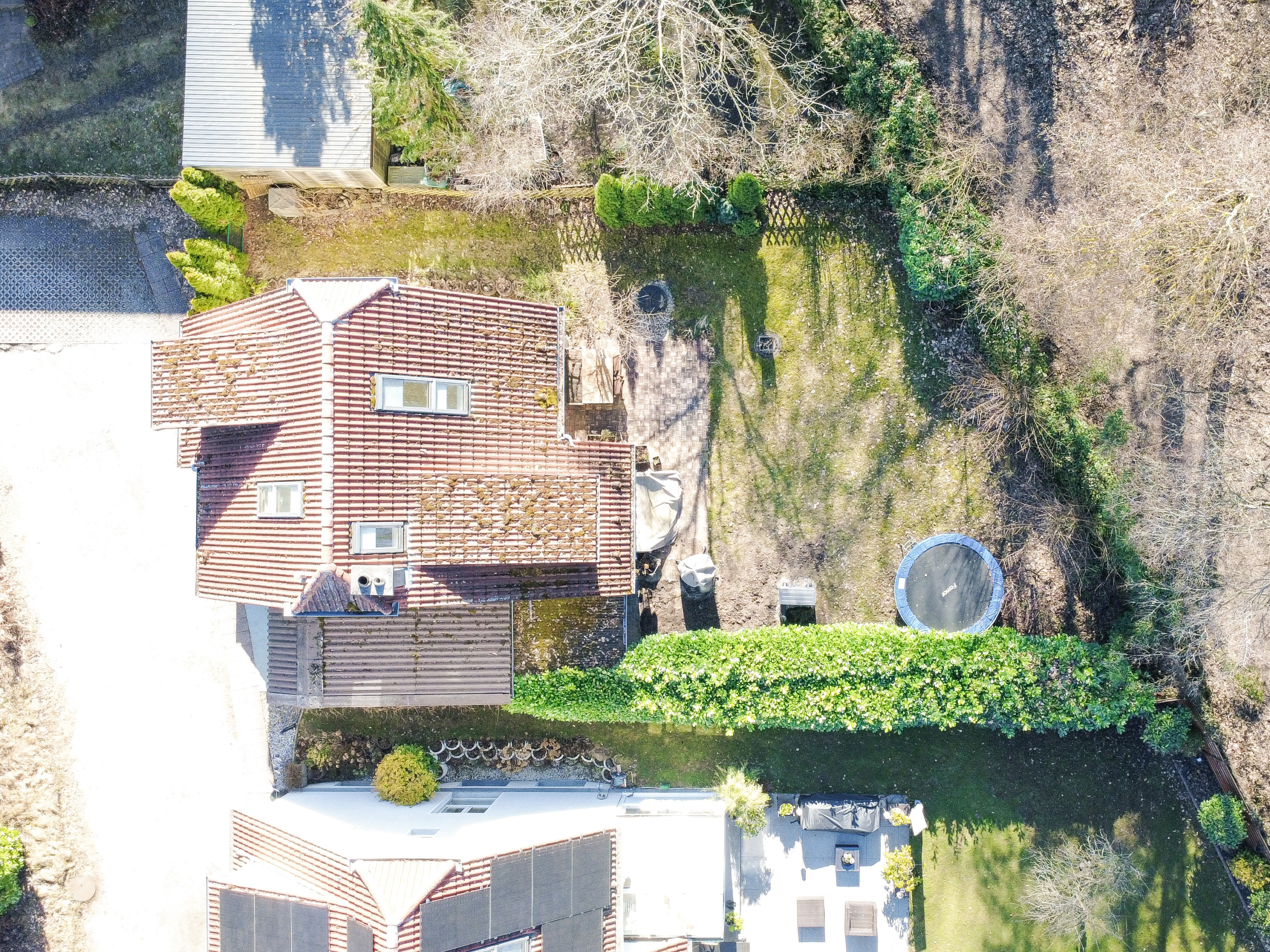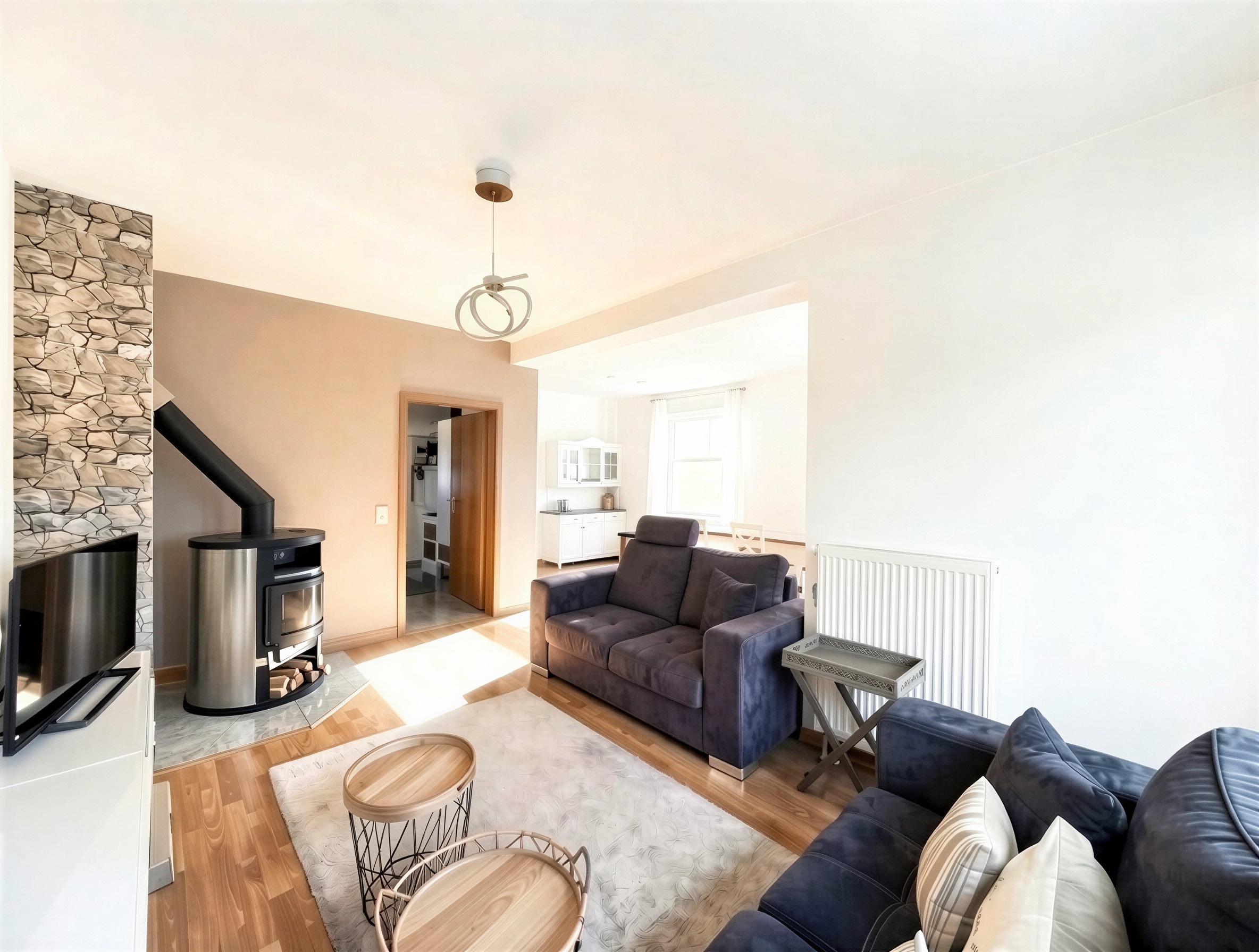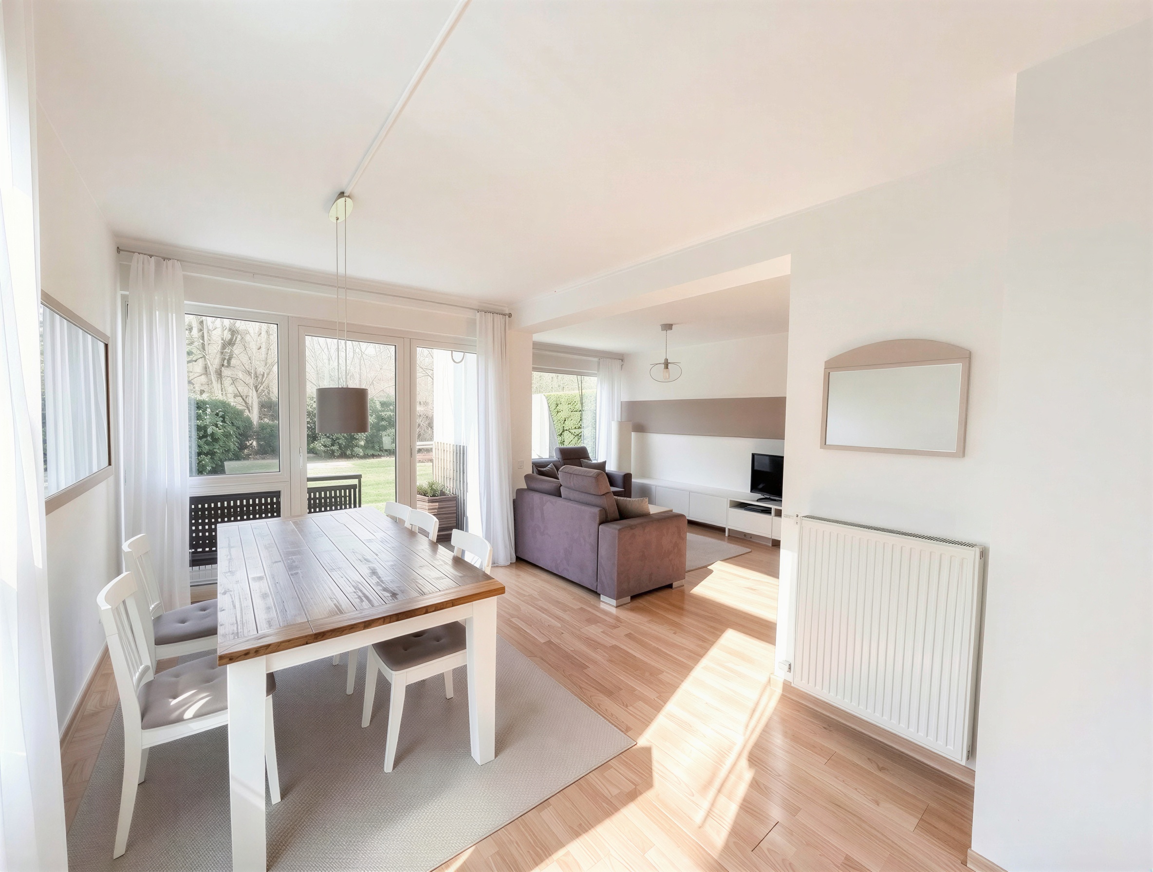 Das Erdgeschoss bildet den zentralen Wohnbereich des Hauses. Hier befindet sich ein großzügiger Wohn- und Essbereich mit direktem Zugang zur Terrasse und zum Garten. Große Fensterflächen sorgen für viel Tageslicht und eine angenehme Wohnatmosphäre. Ein Ofen im Wohnbereich schafft zusätzlich eine besonders gemütliche Atmosphäre. Die Küche liegt separat und ist als eigener Raum ausgeführt. Ergänzt wird diese Ebene durch ein Gäste-WC im Eingangsbereich.