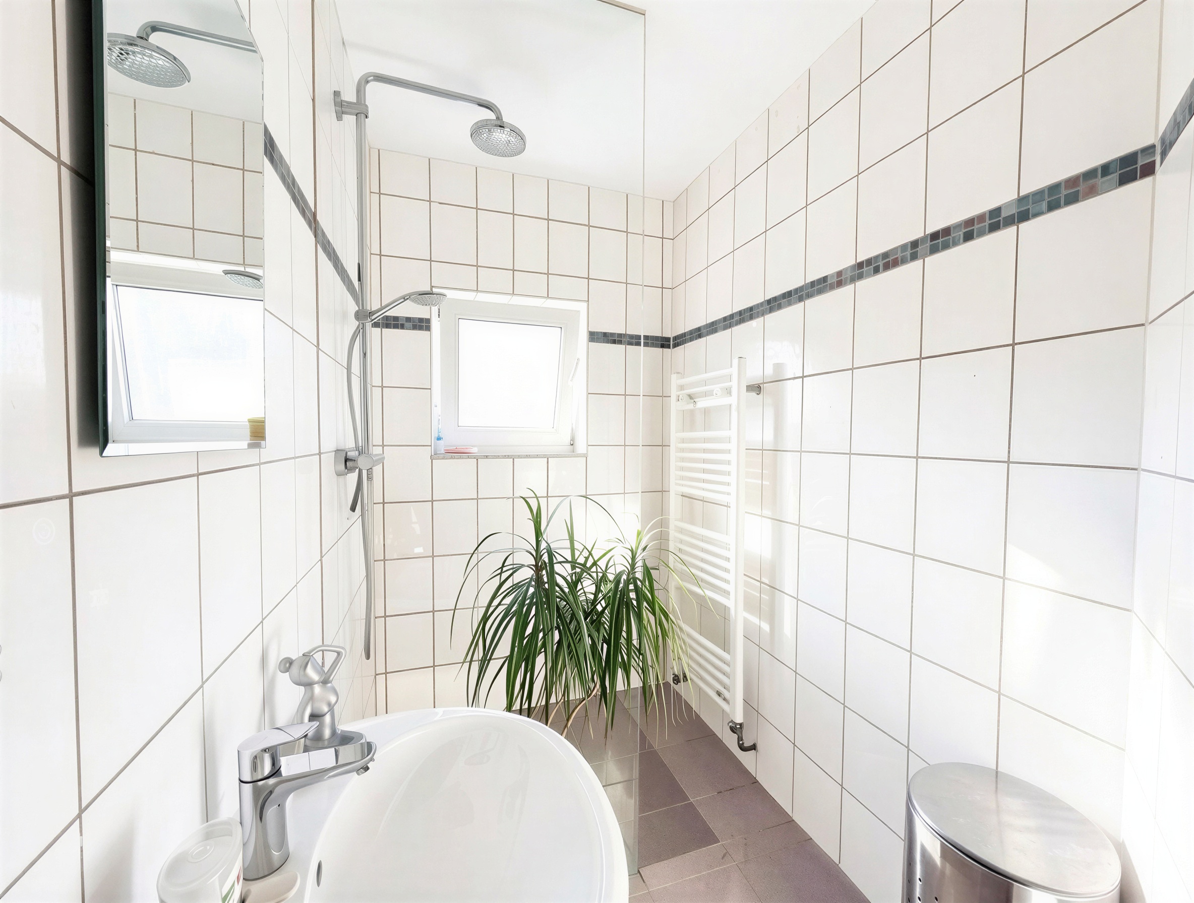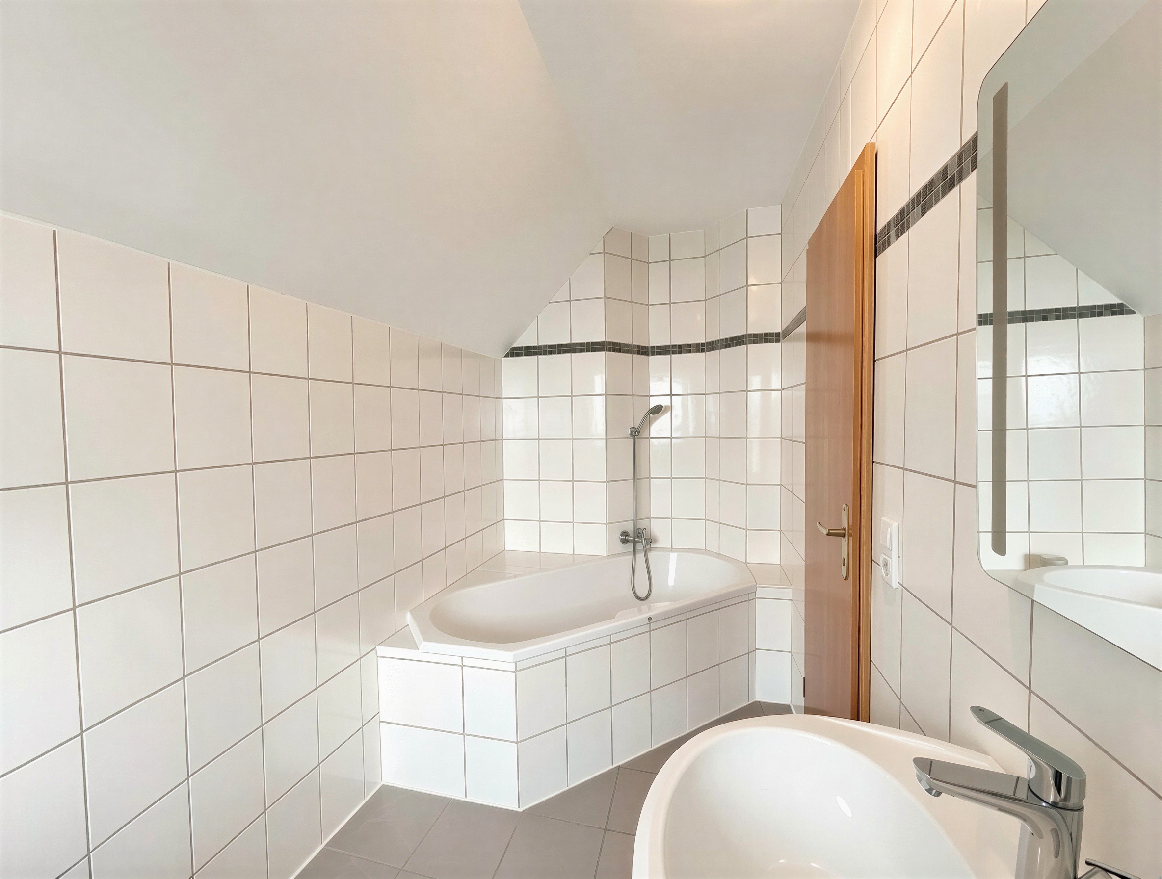 Im ersten Obergeschoss befinden sich drei großzügige Schlafzimmer sowie zwei Tageslichtbäder. Das Hauptbad verfügt über ein Fenster, eine Badewanne und ein WC. Zusätzlich steht ein separates Duschbad mit Fenster zur Verfügung.