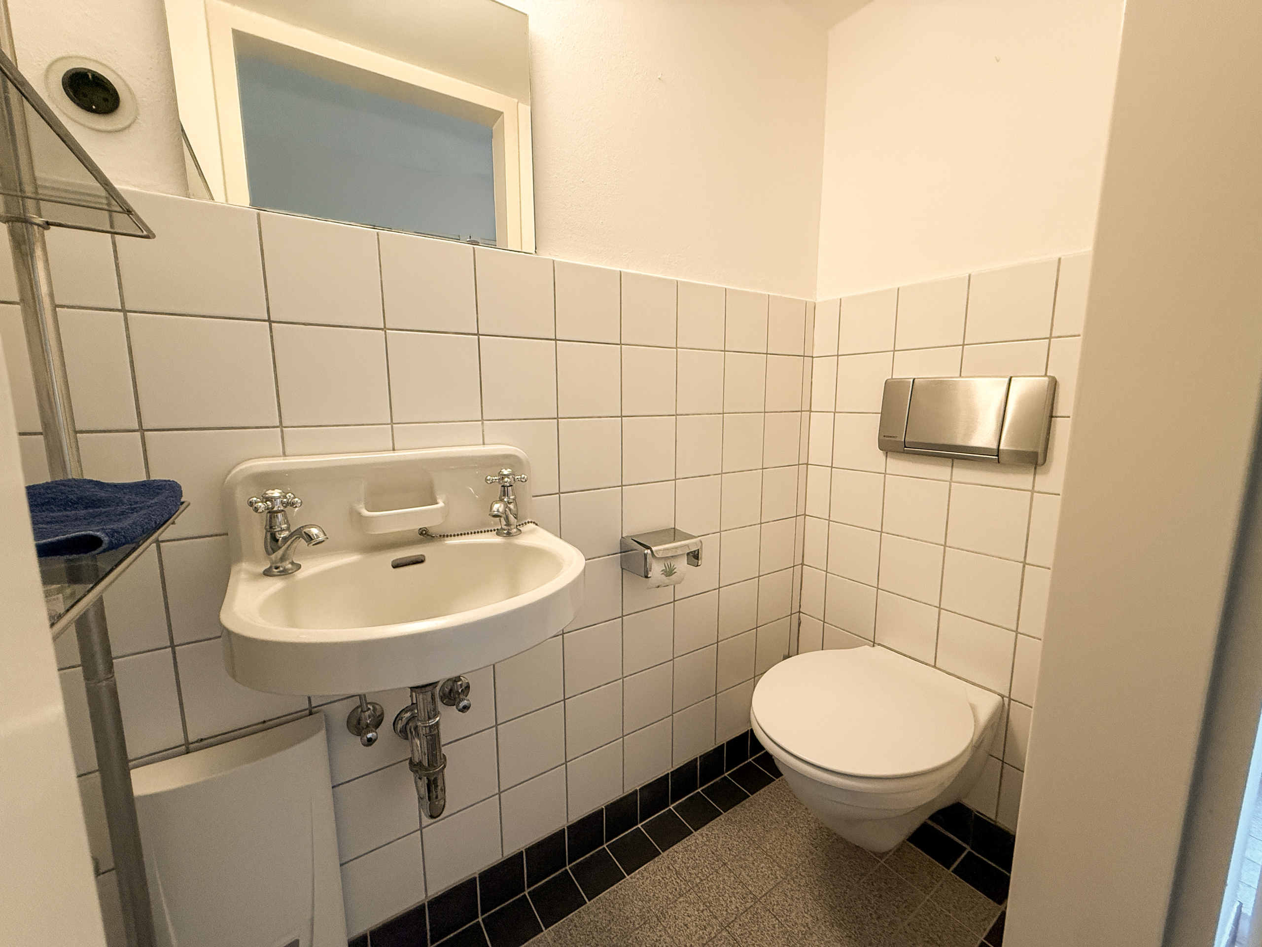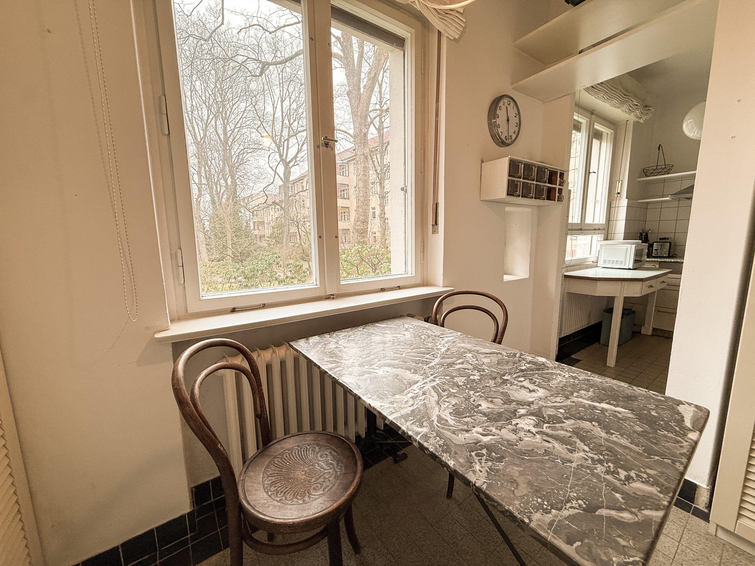 Die separate Küche ist funktional geschnitten und bietet gute Arbeits- und Stellflächen. Direkt angrenzend befindet sich ein zusätzlicher, abgeschlossener Nebenraum mit integrierter Sitzmöglichkeit. Dieser erweitert die Küche um wertvolle Nutzfläche und schafft eine angenehm strukturierte Raumaufteilung. Ob als Frühstücksplatz mit Blick ins Grüne, als diskreter Stauraumbereich oder als flexibel nutzbare Erweiterung der Küche – der Raum eröffnet vielseitige Gestaltungsmöglichkeiten und erhöht den Wohnkomfort spürbar. Das angrenzende Gäste-WC ist sinnvoll in diesen Bereich integriert und rundet die funktionale Gliederung der Wohnung ab.