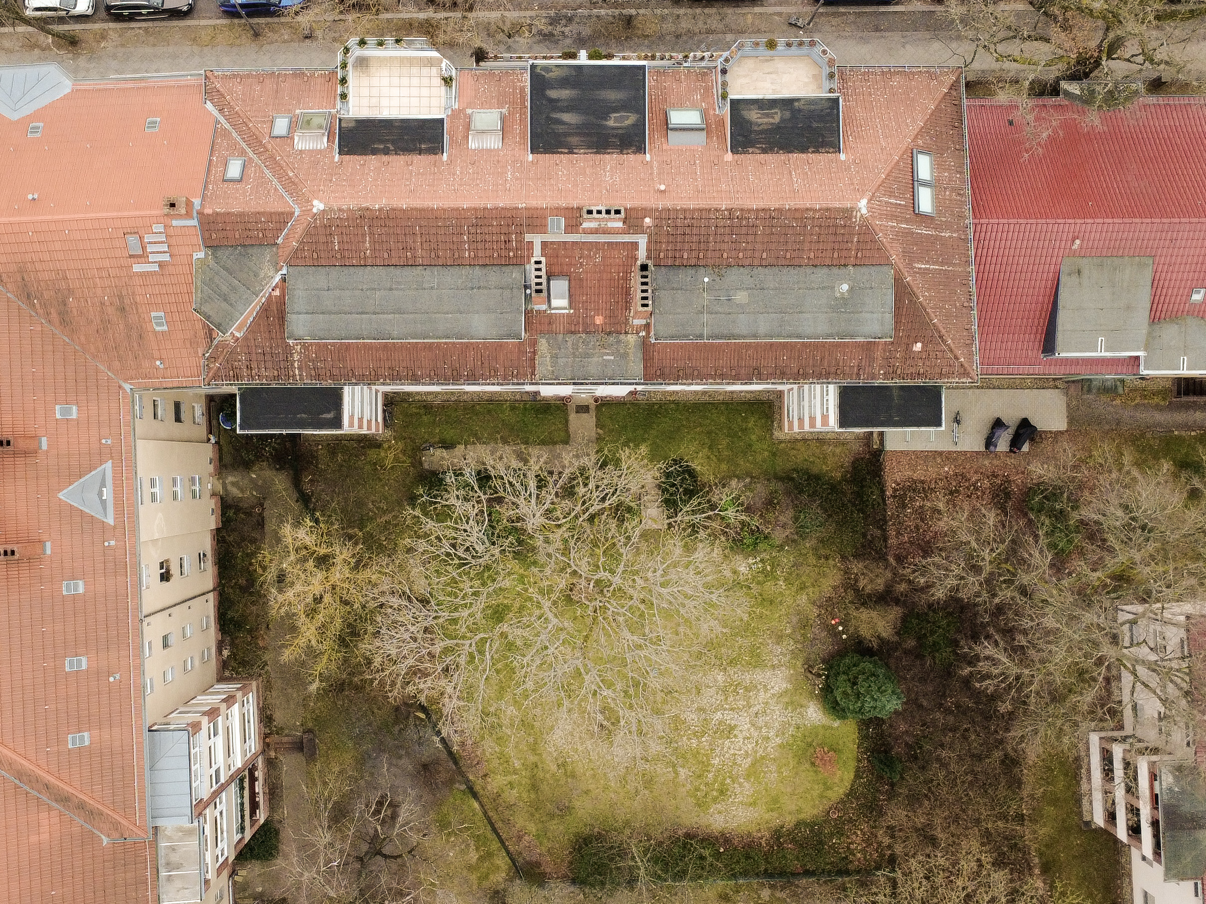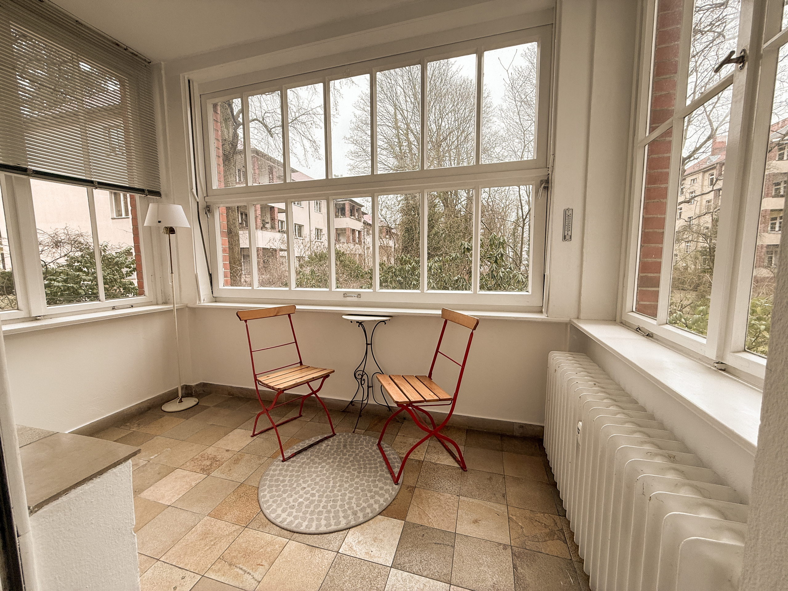 Ein besonderes Highlight ist der Wintergarten mit Blick in den gepflegten, gemeinschaftlich nutzbaren Innenhofgarten. Dieser bietet nicht nur eine ansprechende Aussicht, sondern steht den Bewohnern auch zur Nutzung zur Verfügung. Hier können Sie in ruhiger Atmosphäre im Freien sitzen, einen Kaffee genießen oder einfach entspannen. Der grüne Innenhof schafft eine angenehme, lebendige Hausgemeinschaft, in der sich auch Kinder gelegentlich beim Spielen aufhalten.