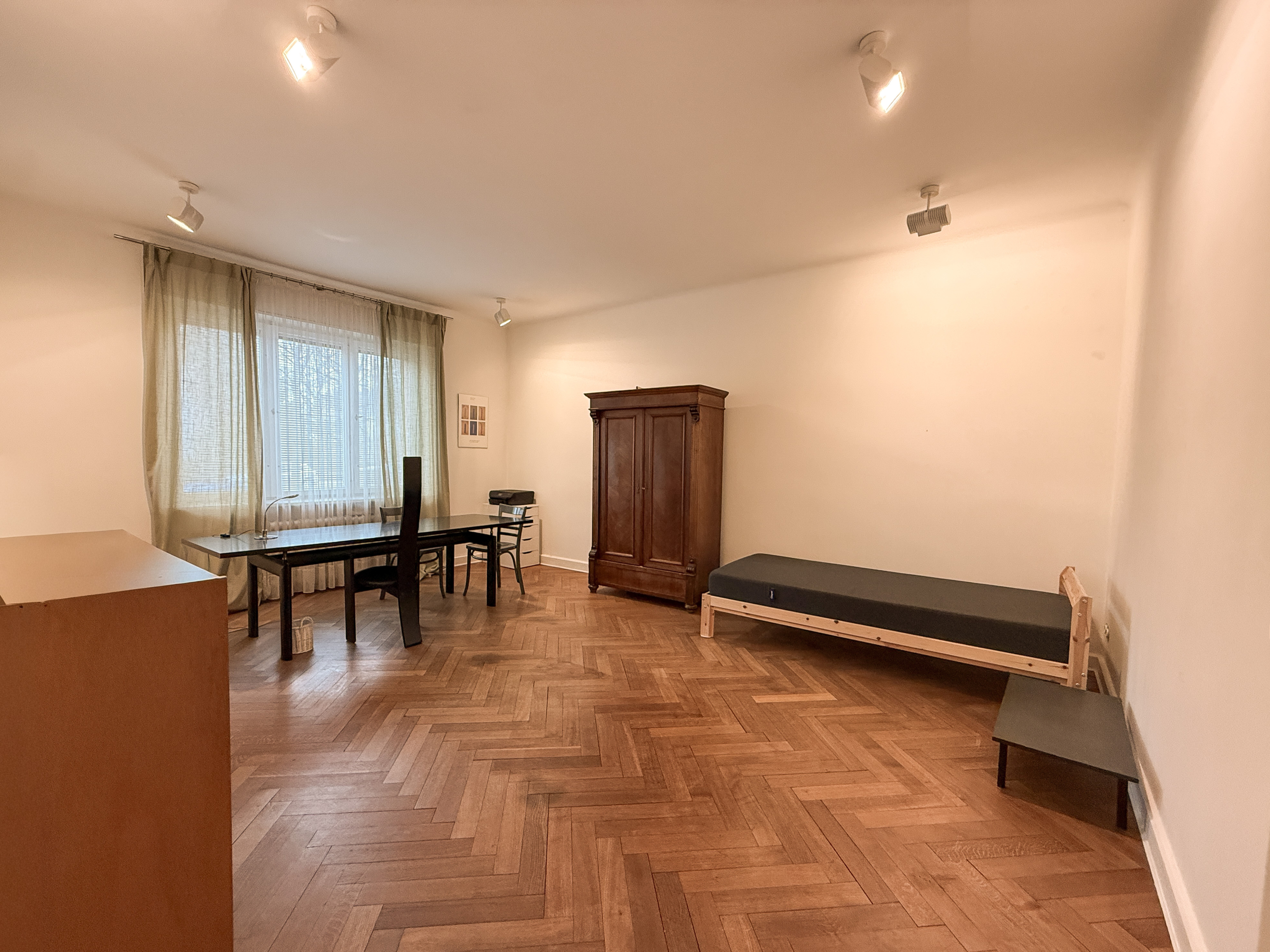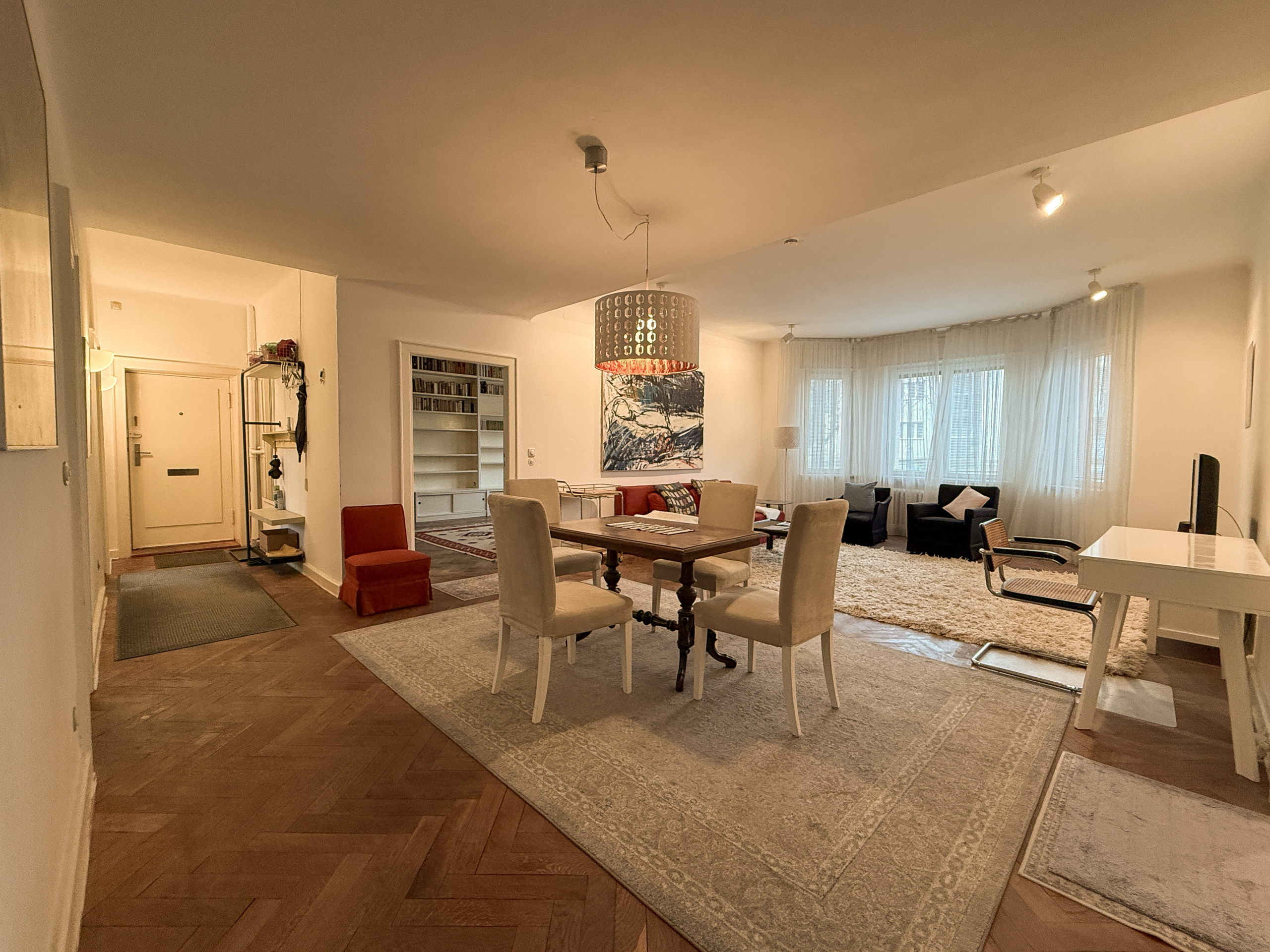 Der Wohn- und Essbereich bildet den zentralen Mittelpunkt der Wohnung. Großzügige Fensterflächen sorgen für eine angenehme Belichtung und unterstreichen das offene Raumgefühl. Der Parkettboden in Fischgrätoptik verleiht dem Raum eine zeitlose Eleganz und eine wertige Ausstrahlung. Die Fläche bietet ausreichend Raum für eine großzügige Möblierung mit separatem Essbereich und schafft eine repräsentative, zugleich wohnliche Atmosphäre.