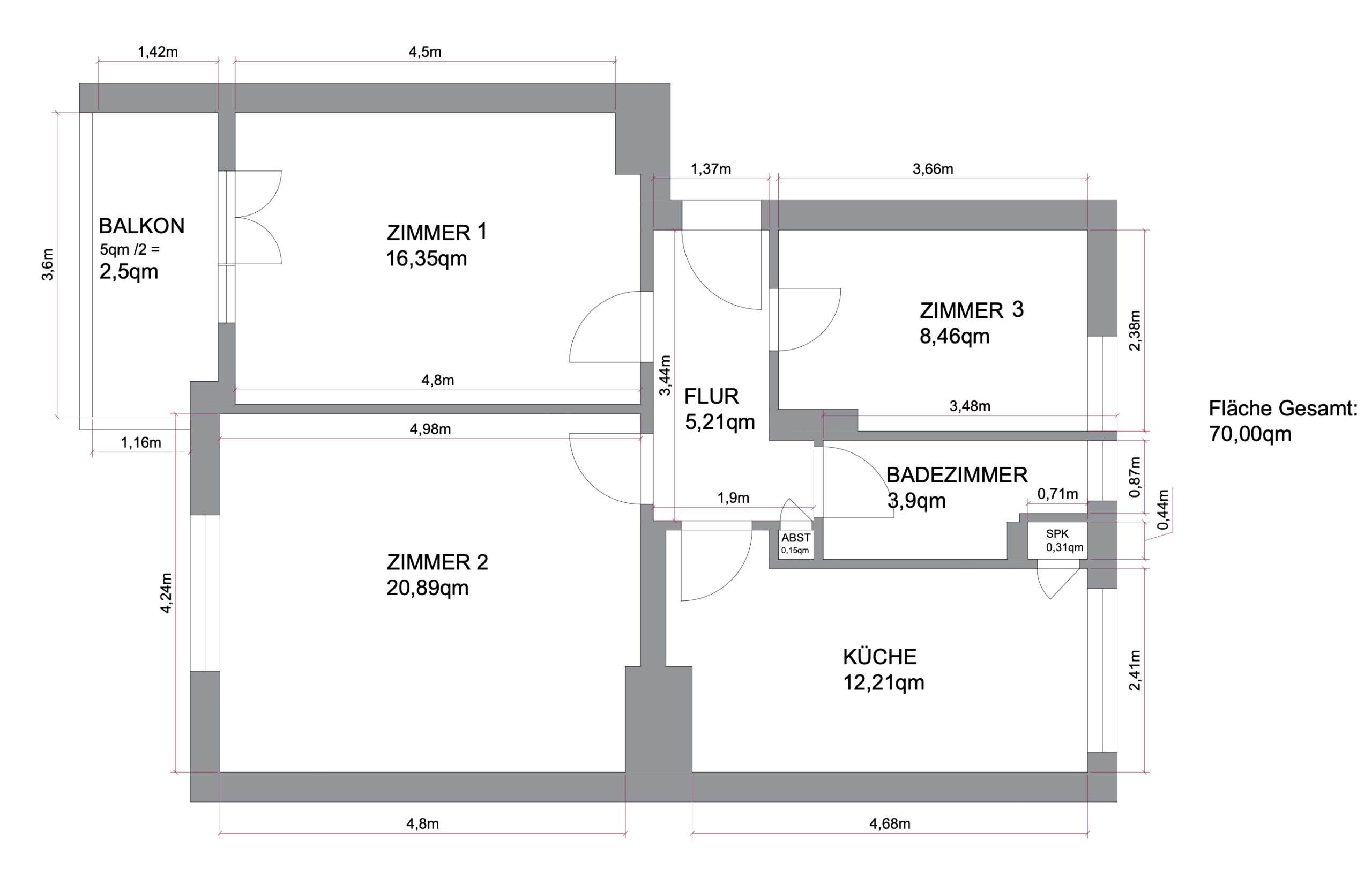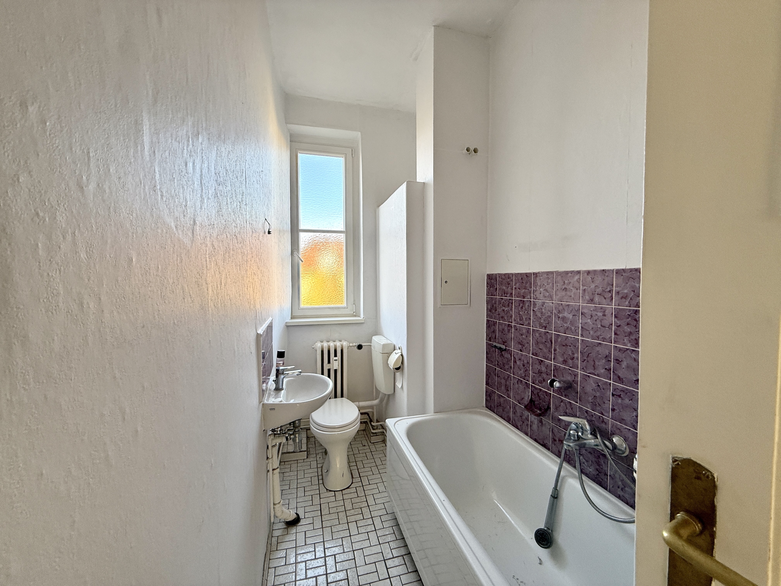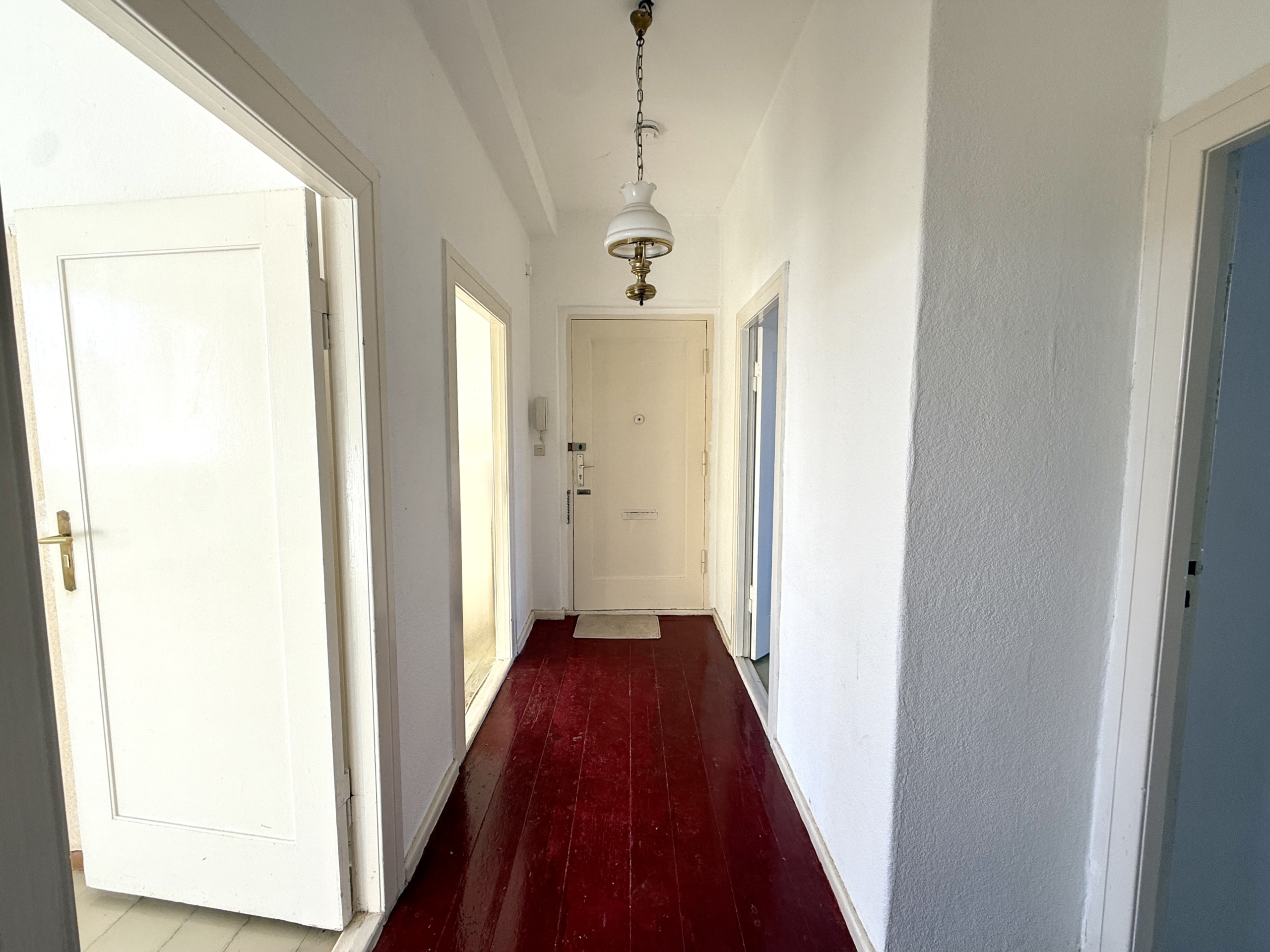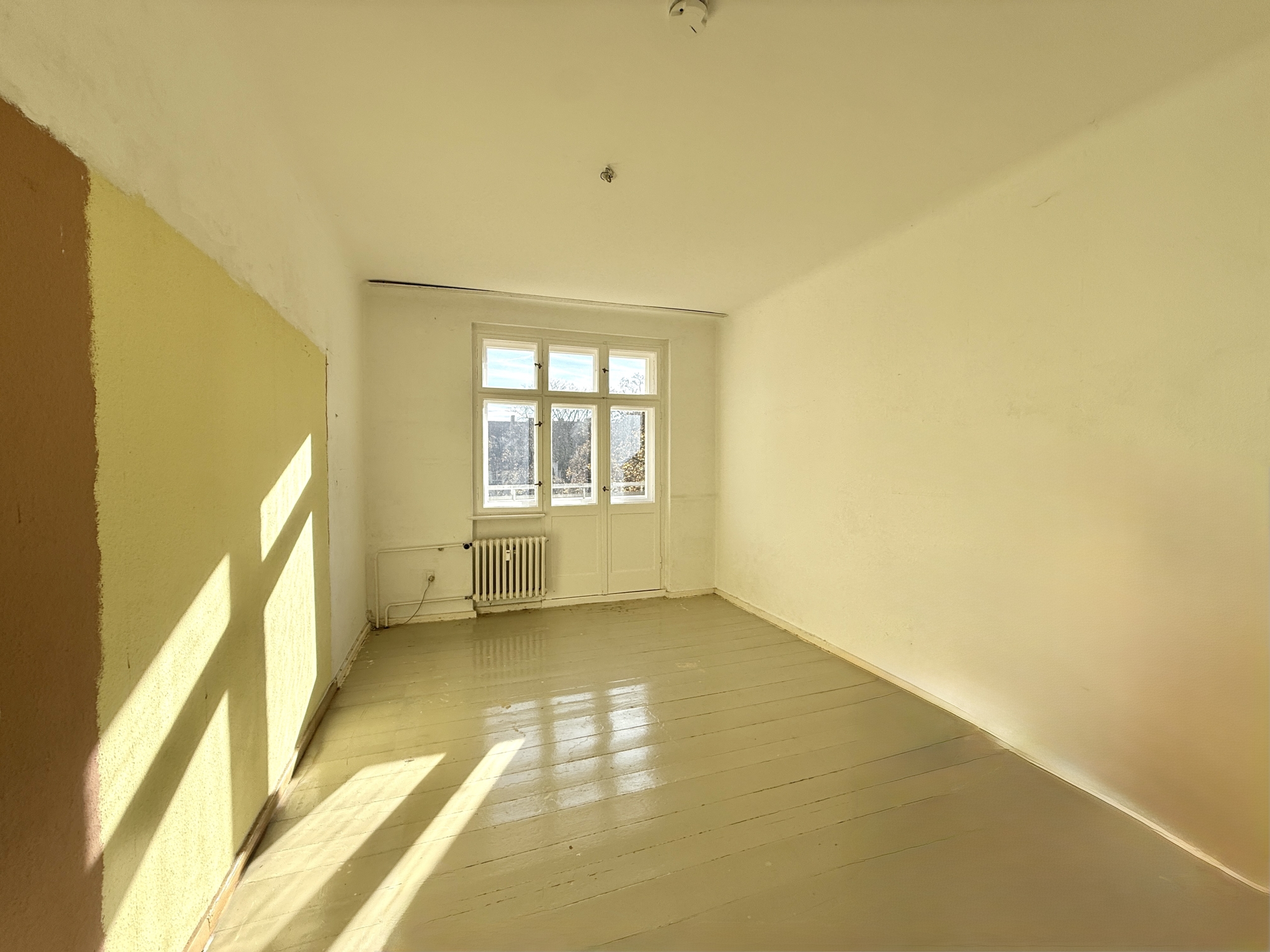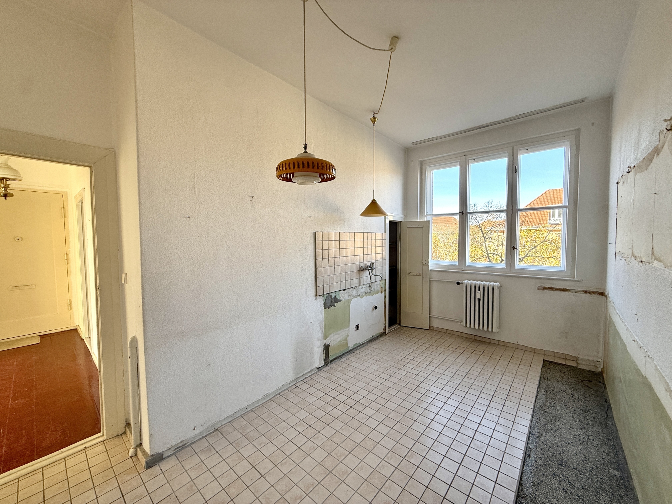 Die Wohnung liegt im 4. OG, ein Aufzug ist nicht vorhanden. Auf rund 70 Quadratmetern verteilen sich drei gut proportionierte Zimmer, eine Küche, ein Bad sowie ein Balkon mit Südost-Ausrichtung in den Innenhof. Besonders hervorzuheben sind die schönen Holzdielen, die derzeit noch unter einer Lackierung verborgen liegen, und der charaktervolle Terrazzo-Boden, der sich unter den Fliesen in der Küche befindet.