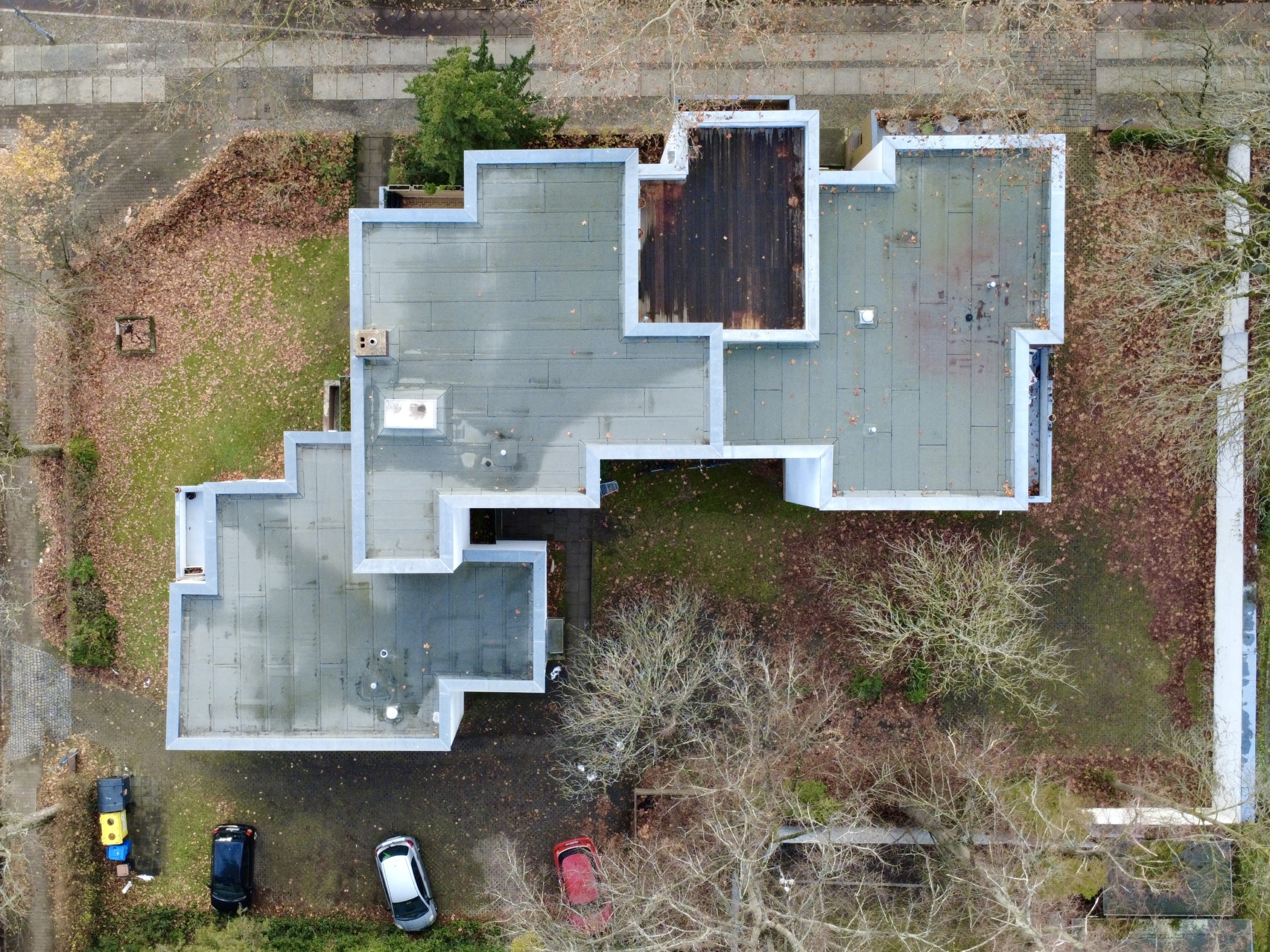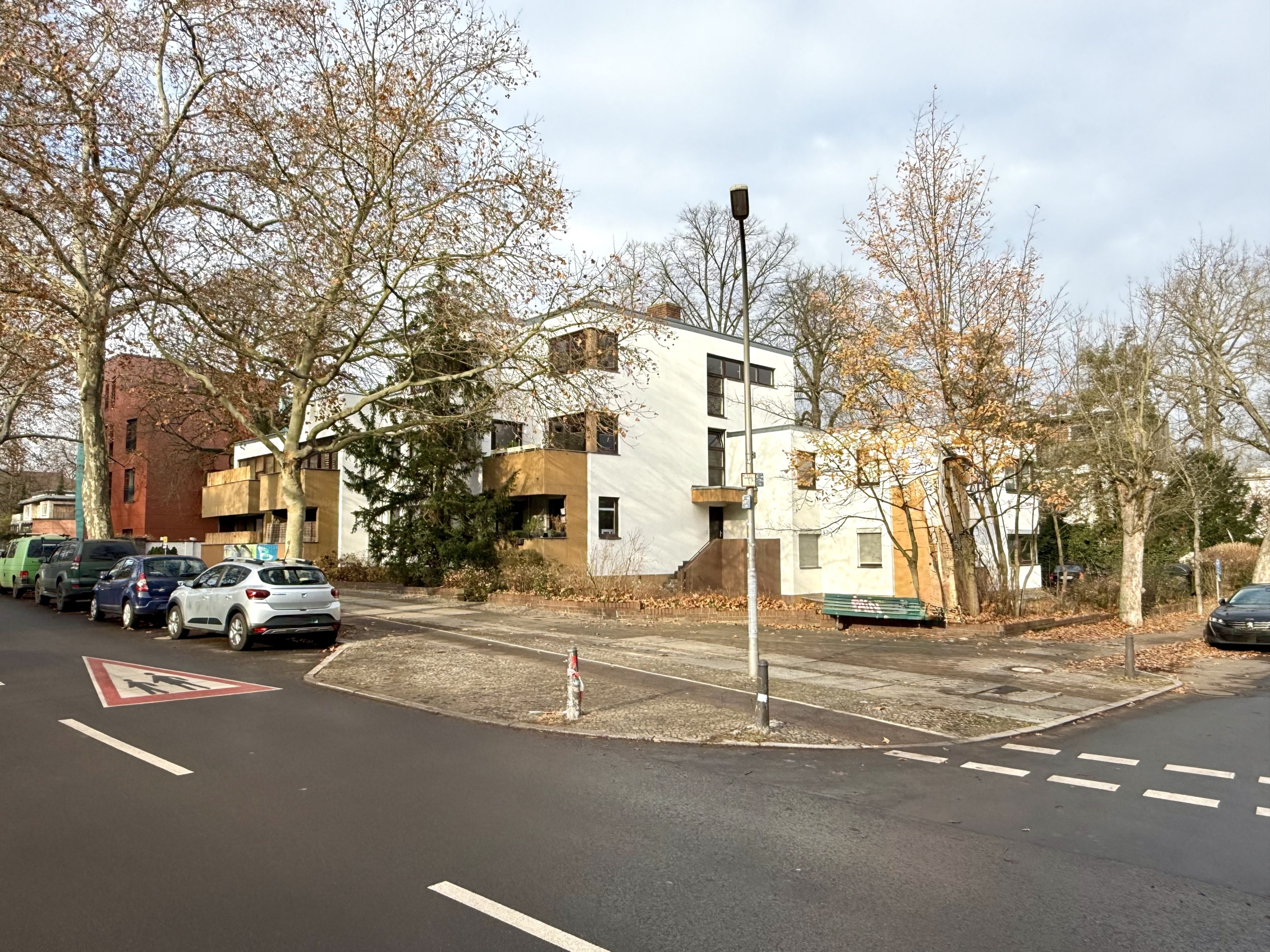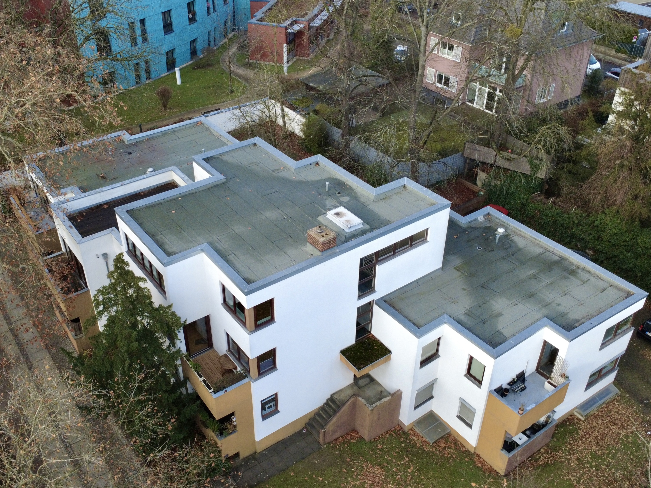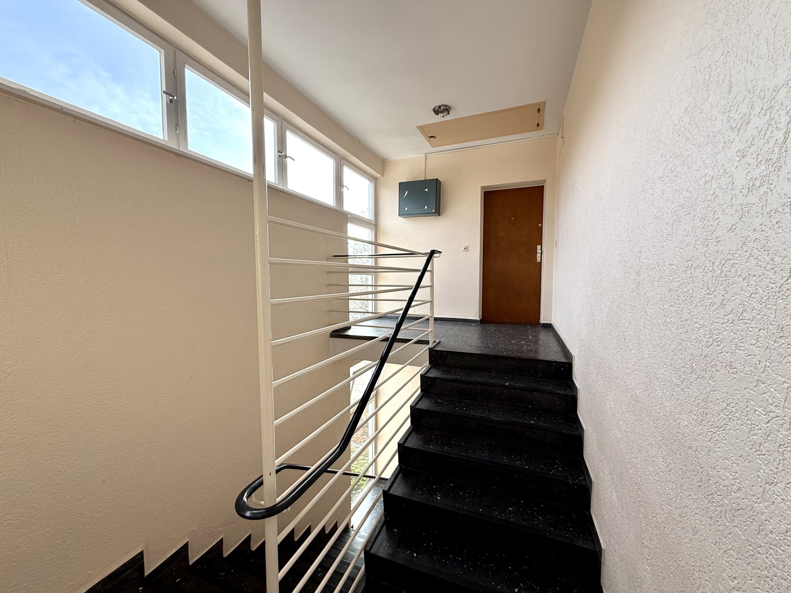 Das Wohnhaus aus dem Jahr 1970 repräsentiert die sachliche, funktionale Architektur dieser Zeit: klare Baukörper, großzügige Fensterflächen und eine auf Wohnqualität ausgerichtete Grundrissstruktur. Als solide errichtetes Eckhaus umfasst es elf Wohneinheiten und steht auf einem 1.303 m² großen Grundstück. Das Dach wurde in den letzten Jahren erneuert, und die Dachterrasse der hier angebotenen Endetagenwohnung erhielt einen neuen Holzbelag. Das gepflegte, helle Treppenhaus führt über eine angenehm leichtgängige Treppe zur Wohnung, wodurch das Fehlen eines Aufzugs kaum ins Gewicht fällt. Die Wärmeversorgung erfolgt über eine zentrale Ölheizung im Kellergeschoss, die Warmwasserversorgung erfolgt dezentral innerhalb der Wohnungen.