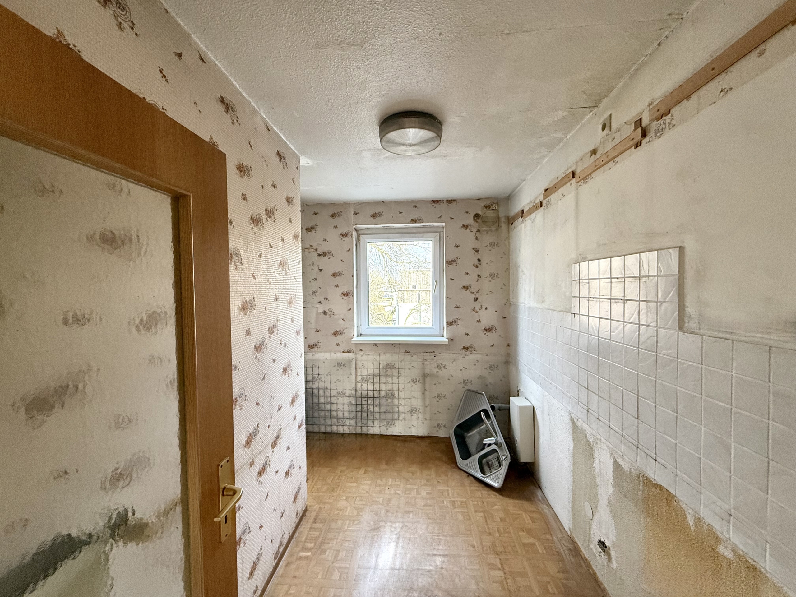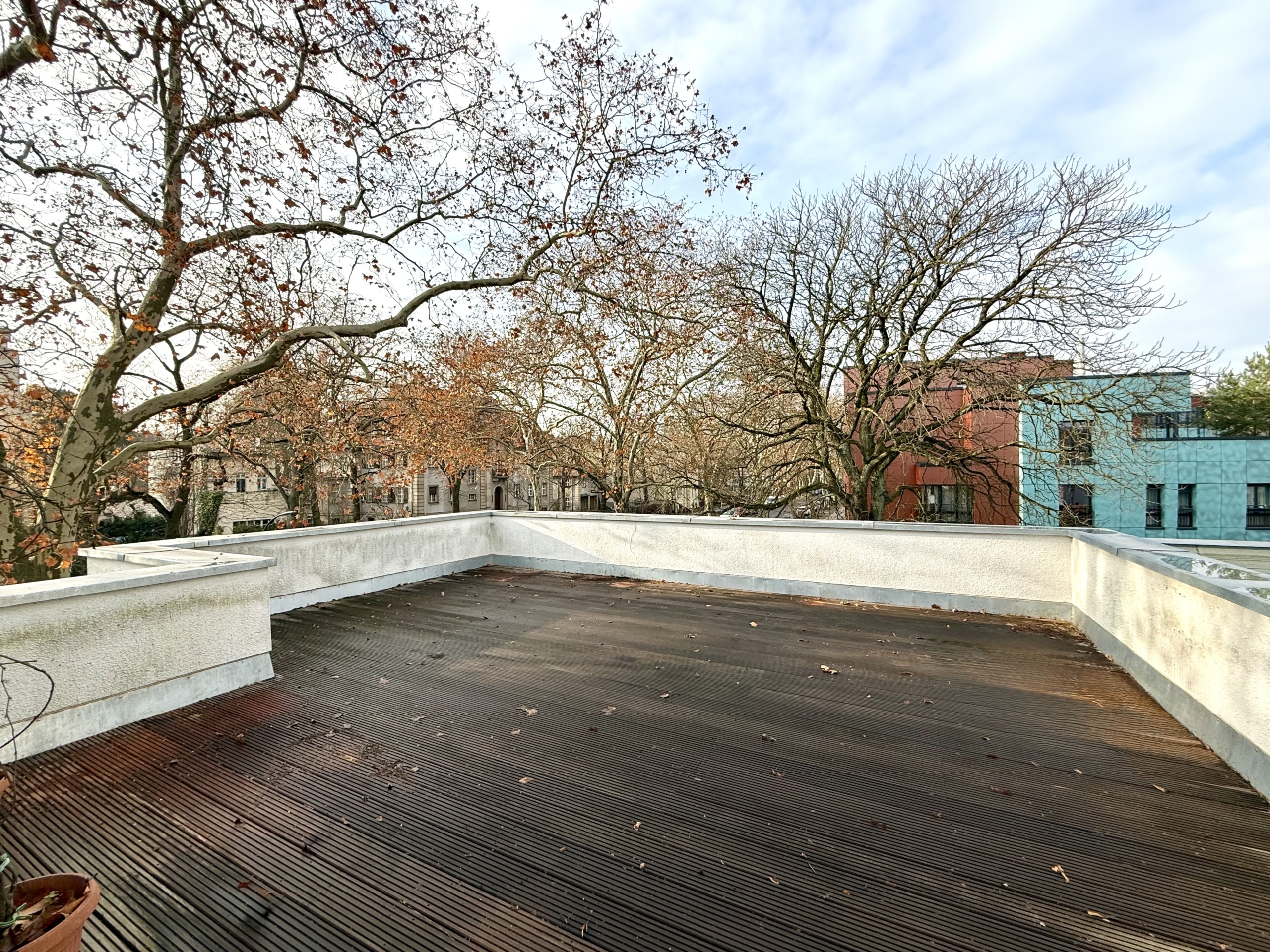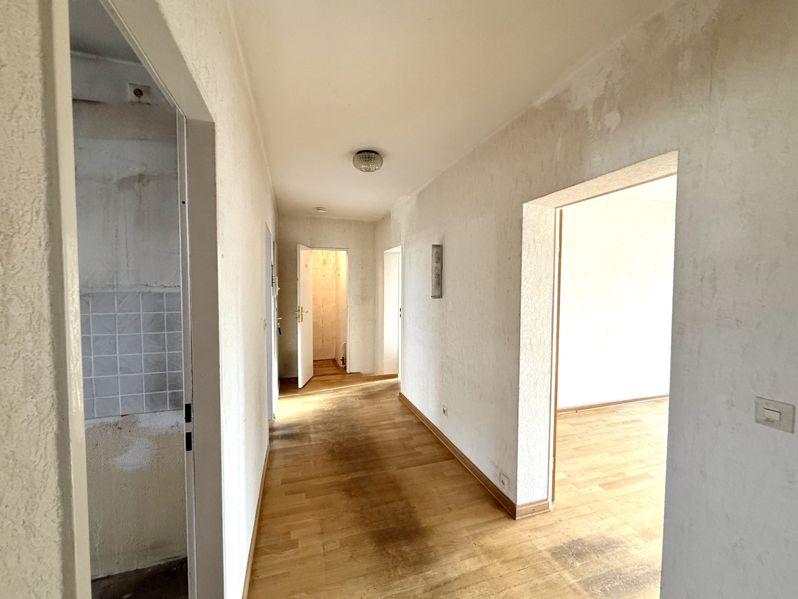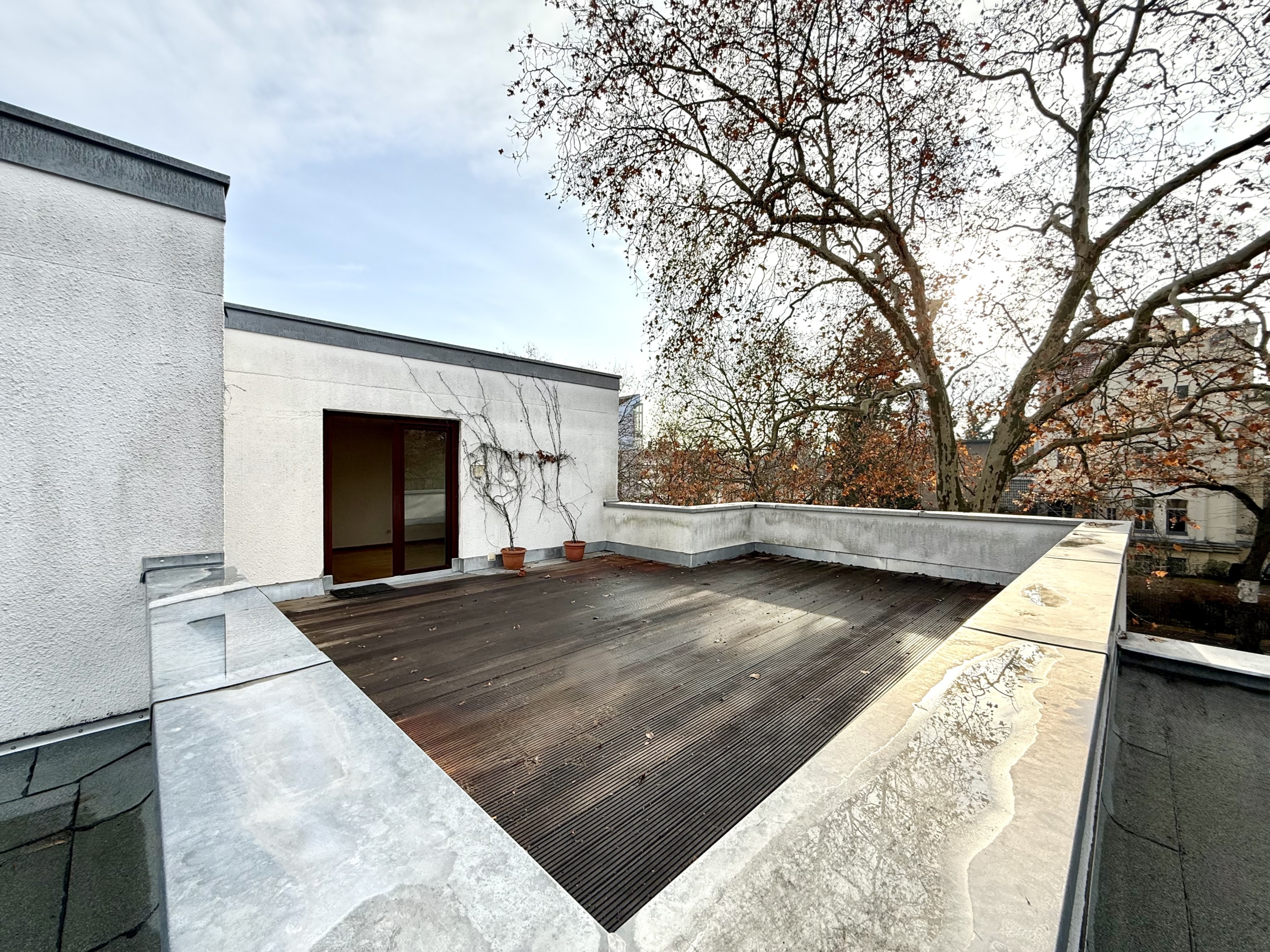 Die Wohnung befindet sich in der Endetage und bietet als Drei-Zimmer-Wohnung rund 86,88 m² Wohnfläche. Ein großzügiger Flur erschließt zwei ruhige Schlafzimmer, die Küche, ein Tageslichtbad sowie einen praktischen Abstellraum. Der weitläufige Wohn- und Essbereich öffnet sich über große Fensterfronten zur rund 35,36 m² großen Dachterrasse, die unmittelbar an den Wohnraum anschließt und der Wohnung eine seltene Qualität verleiht – insbesondere für West-Berliner Bauten dieser Epoche. Die angenehme Deckenhöhe, die klar proportionierten Räume sowie Parkettboden und Kunststofffenster prägen das Wohngefühl. Die Wohnung wurde vollständig beräumt und bietet nun erhebliches Potenzial für eine zeitgemäße Modernisierung.
