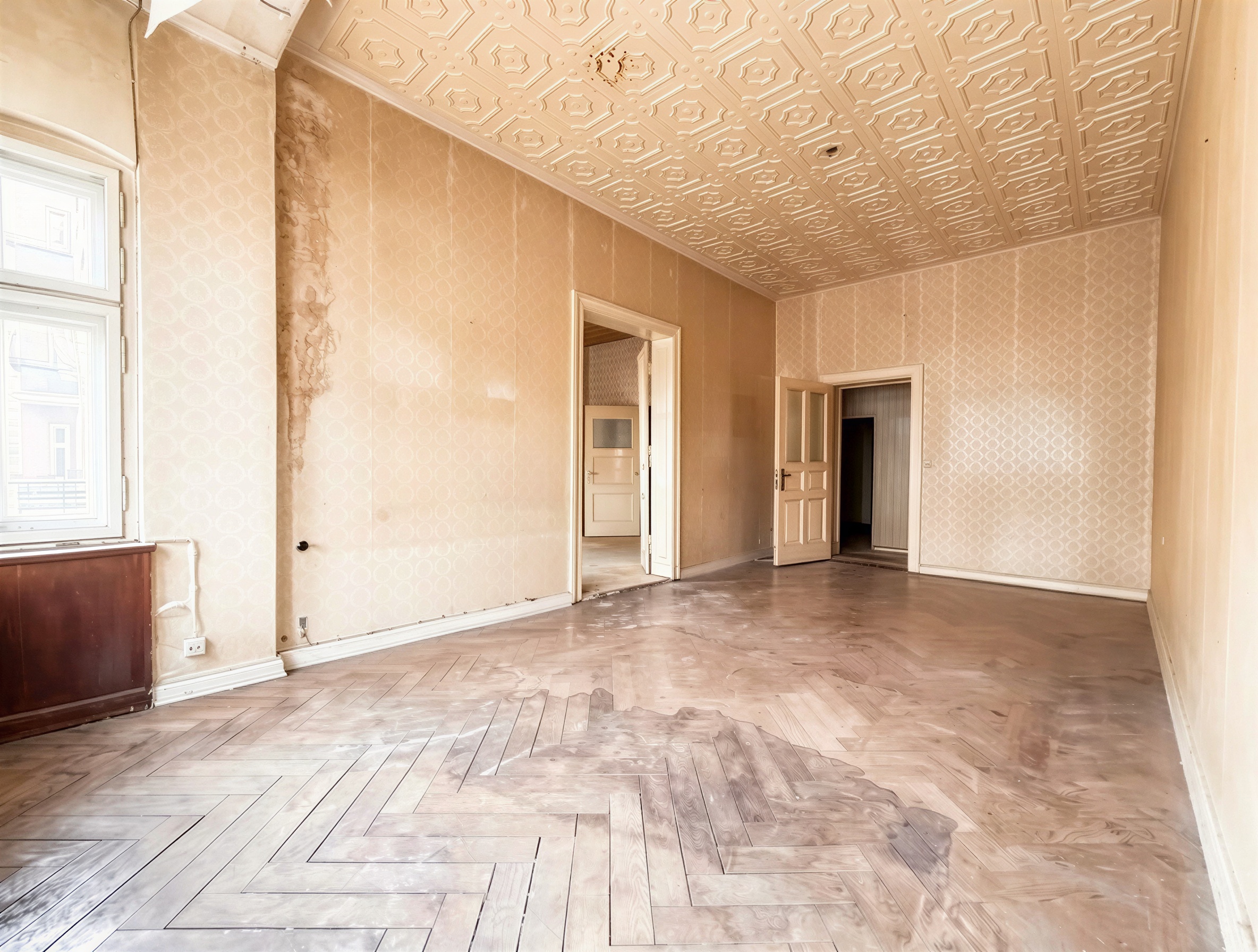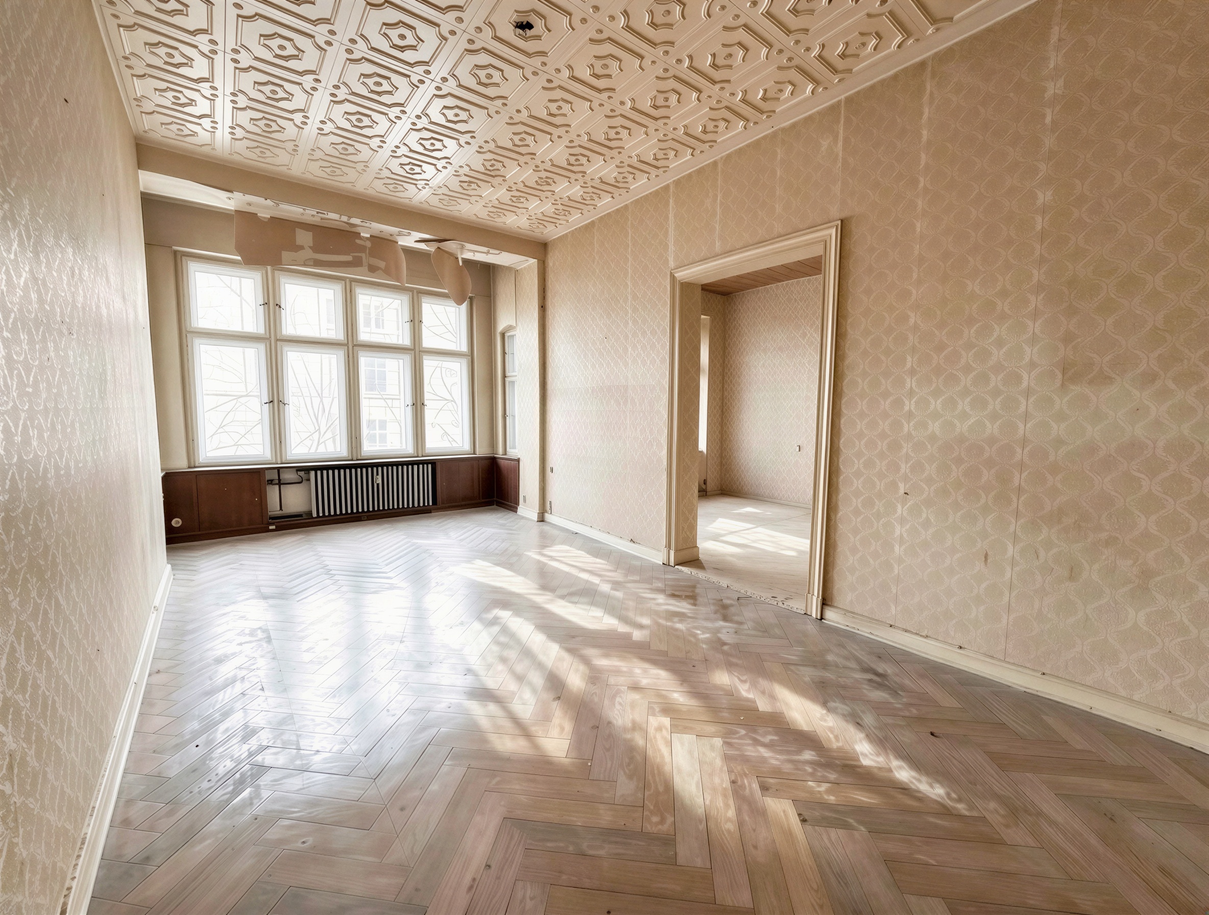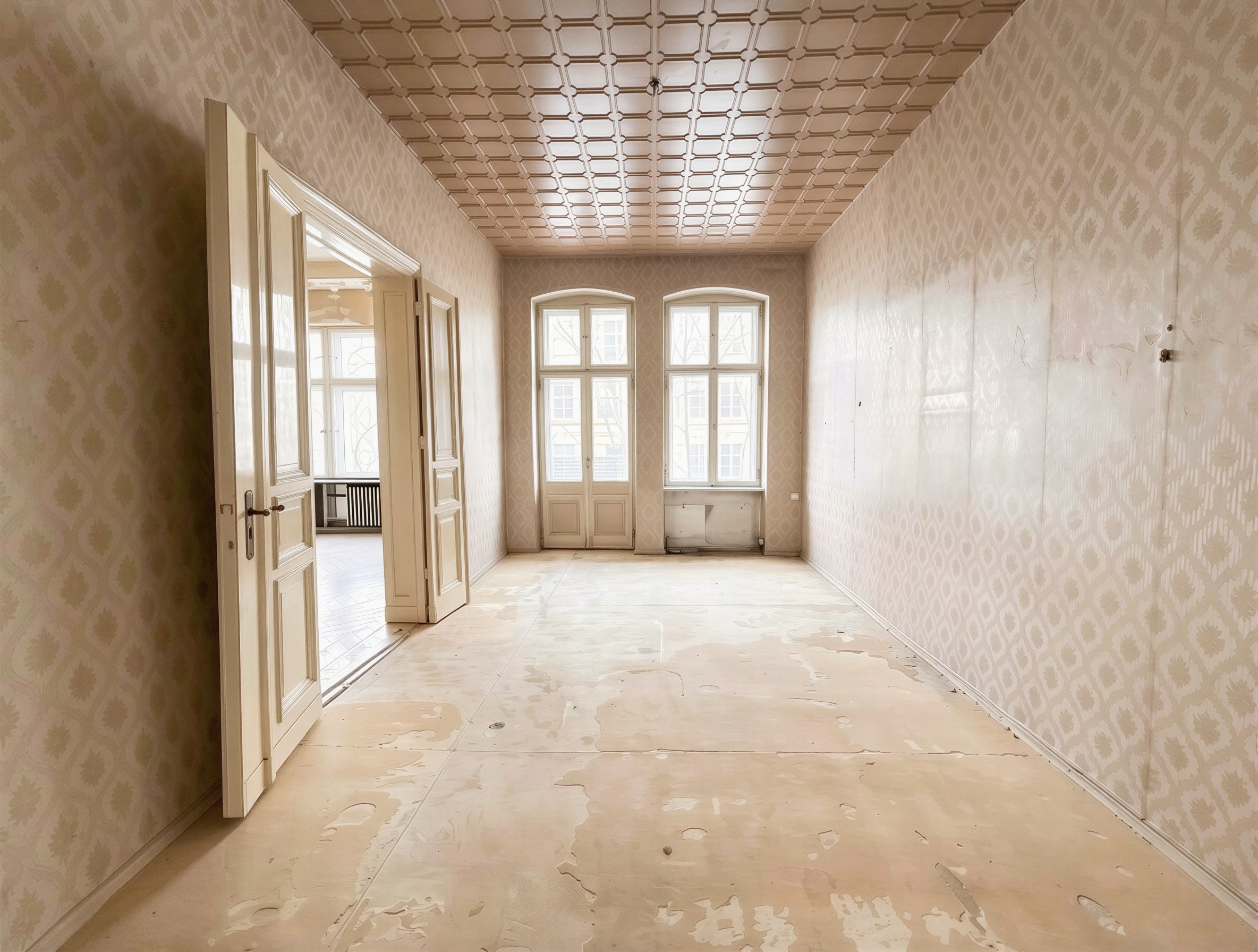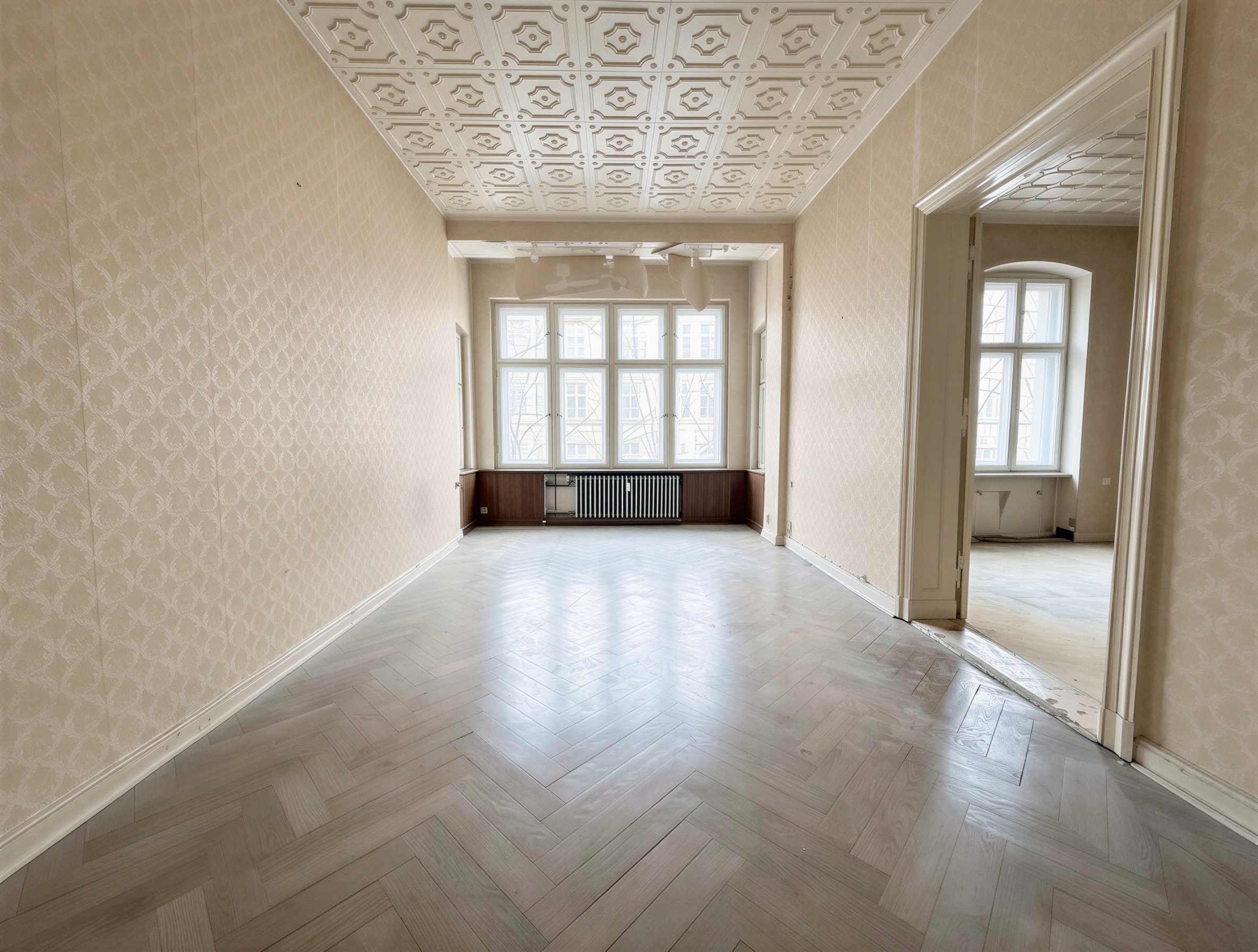 Die Wohnung liegt im ersten Obergeschoss. Der Grundriss umfasst derzeit drei großzügige Zimmer, eine separate Küche, ein Badezimmer mit Tageslicht sowie eine zusätzliche Kammer. Hohe Decken, klare Raumachsen und die typischen Proportionen eines Berliner Altbaus verleihen den Räumen eine angenehme Großzügigkeit und ein sehr gutes Raumgefühl. Besonders prägend ist die klassische Raumfolge im Wohnbereich. Zwei der großen Zimmer sind über eine originale Flügeltür miteinander verbunden und schaffen eine elegante Verbindung der Räume. Dadurch kann ein großzügiger Wohn- und Essbereich entstehen, gleichzeitig bleibt die Nutzung als zwei separate Zimmer problemlos möglich. Große Fensterflächen sorgen für viel Tageslicht und unterstreichen den offenen Charakter der Räume. Teilweise vorhandene Parkett- und Holzdielenböden unterstreichen den klassischen Altbaucharakter der Wohnung und tragen zur wohnlichen Atmosphäre bei. Das dritte Zimmer bietet vielseitige Nutzungsmöglichkeiten, etwa als Schlafzimmer, Arbeitszimmer oder Gästezimmer.