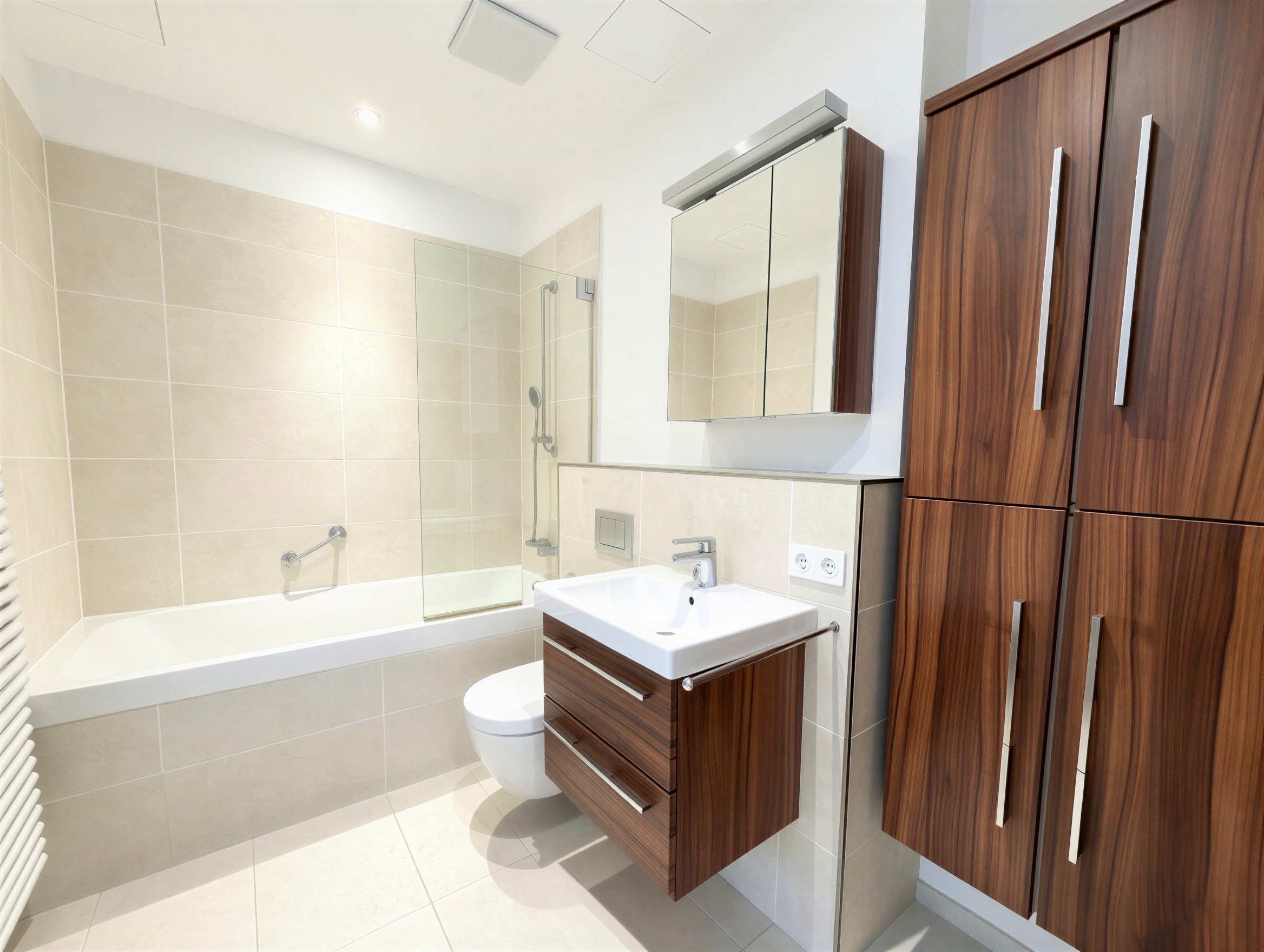 Auch die Küche ist ein Ausdruck dieses hohen Anspruchs. Die elegante Granit-Arbeitsplatte, hochwertige Einbaugeräte und sehr gut integrierte Stauraumlösungen schaffen ein Gesamtbild, das sowohl funktional als auch ästhetisch überzeugt. Ergänzt wird dies durch durchdacht eingepasste Einbauschränke sowie ein hochwertig ausgestattetes Badezimmer mit sehr geschmackvoll ausgeführten Einbauten. Auch das Schlafzimmer fügt sich harmonisch in das Gesamtkonzept ein und bietet einen angenehm ruhigen, klar proportionierten Rückzugsbereich.