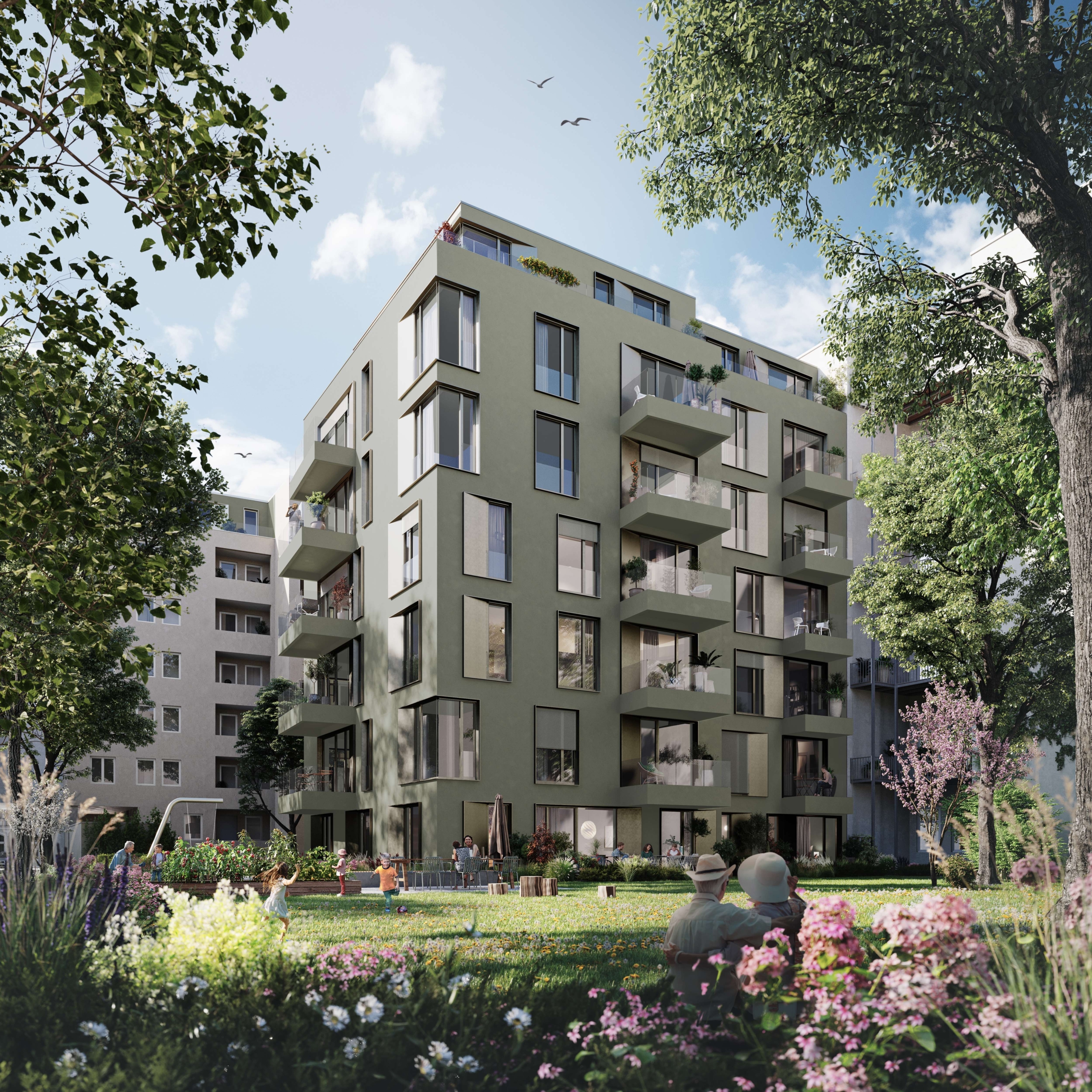 Mitten im begehrten Charlottenburg, verborgen in einem ruhigen Gartenhof unweit des Kurfürstendamms, erhebt sich EMIL – ein architektonisches Meisterwerk, das stilvolles Wohnen, höchste Bauqualität und nachhaltige Eleganz in perfekter Harmonie vereint. In einer charmanten Seitenstraße gelegen, entfaltet dieses exklusive Neubauprojekt seine Wirkung als grüne Oase der Ruhe und Raffinesse im pulsierenden Zentrum der Hauptstadt. Das Ensemble umfasst 19 außergewöhnliche Eigentumswohnungen, deren individuelle Grundrisslösungen ebenso überzeugen wie ihre klare architektonische Handschrift. Die Ausrichtung nach Süden, Osten und Westen sorgt für lichtdurchflutete Räume mit weiten Blickachsen und einzigartiger Wohnatmosphäre. Die Wohnungsgrößen reichen von edlen 2-Zimmer-Apartments bis hin zu großzügigen 5-Zimmer-Familienresidenzen, die alle mit durchdachter Funktionalität, großzügigen Flächen und feinsinnigen Details beeindrucken. Herzstück der größeren Wohnungen sind die weitläufigen Wohn- und Essbereiche – perfekt für gesellige Abende ebenso wie für ruhige Stunden im privaten Rahmen. Ergänzt werden sie durch separate Schlaf- und Gästezimmer, luxuriöse Privatbereiche mit En-Suite-Badezimmern, großzügige Eingangsbereiche mit viel Stauraum sowie praktische Hauswirtschaftsräume. Jede Wohnung verfügt über mindestens einen Balkon, viele bieten zwei oder sogar Terrassen mit Ausblicken in mehrere Himmelsrichtungen. Die Architektur folgt einer klaren, modernen Linienführung, die durch großflächige Fensterelemente mit edlen Metallpaneelen eine unverwechselbare Charakteristik erhält. EMIL erreicht die höchste Energieeffizienzklasse (KfW-40-Standard) – ein klares Bekenntnis zu Zukunftsfähigkeit, Werterhalt und ökologischem Bewusstsein. So wohnen Sie nicht nur stilvoll, sondern auch nachhaltig. In der hauseigenen Tiefgarage, bequem erreichbar über einen modernen Autoaufzug, stehen 11 Stellplätze mit integrierter E-Ladefunktion zur Verfügung – ein weiterer Ausdruck des zukunftsorientierten Konzepts. Auch in der Innenausstattung zeigt sich der kompromisslose Anspruch: Edles Parkett von Bauwerk, exquisite italienische Fliesen von Marazzi, moderne Sanitärobjekte von Duravit, exklusive Armaturen von Axor und hochwertige Edelstahlgriffe von FSB verschmelzen zu einem harmonischen Gesamtbild aus Ästhetik, Qualität und Komfort. Der aufwendig gestaltete, grüne Hofbereich mit stilvollen Neupflanzungen, großzügigen Rasenflächen und einem behutsam integrierten Spielbereich bietet Erholung und Begegnung gleichermaßen – ein Ort des Ankommens und Wohlfühlens für alle Generationen. EMIL ist mehr als Wohnen – es ist ein Statement für Menschen mit Sinn für das Besondere, für Qualität, Ästhetik und urbanes Leben auf höchstem Niveau.