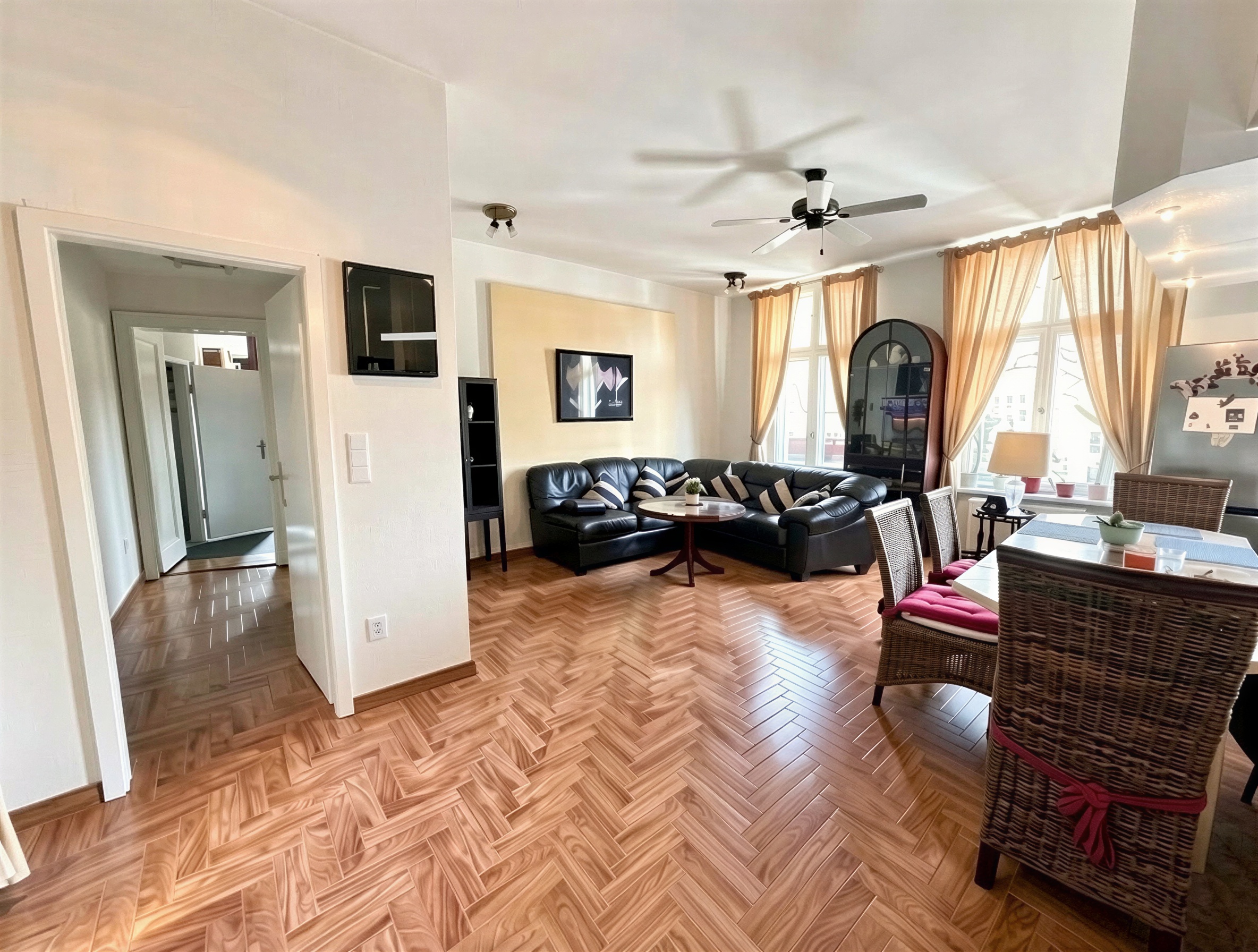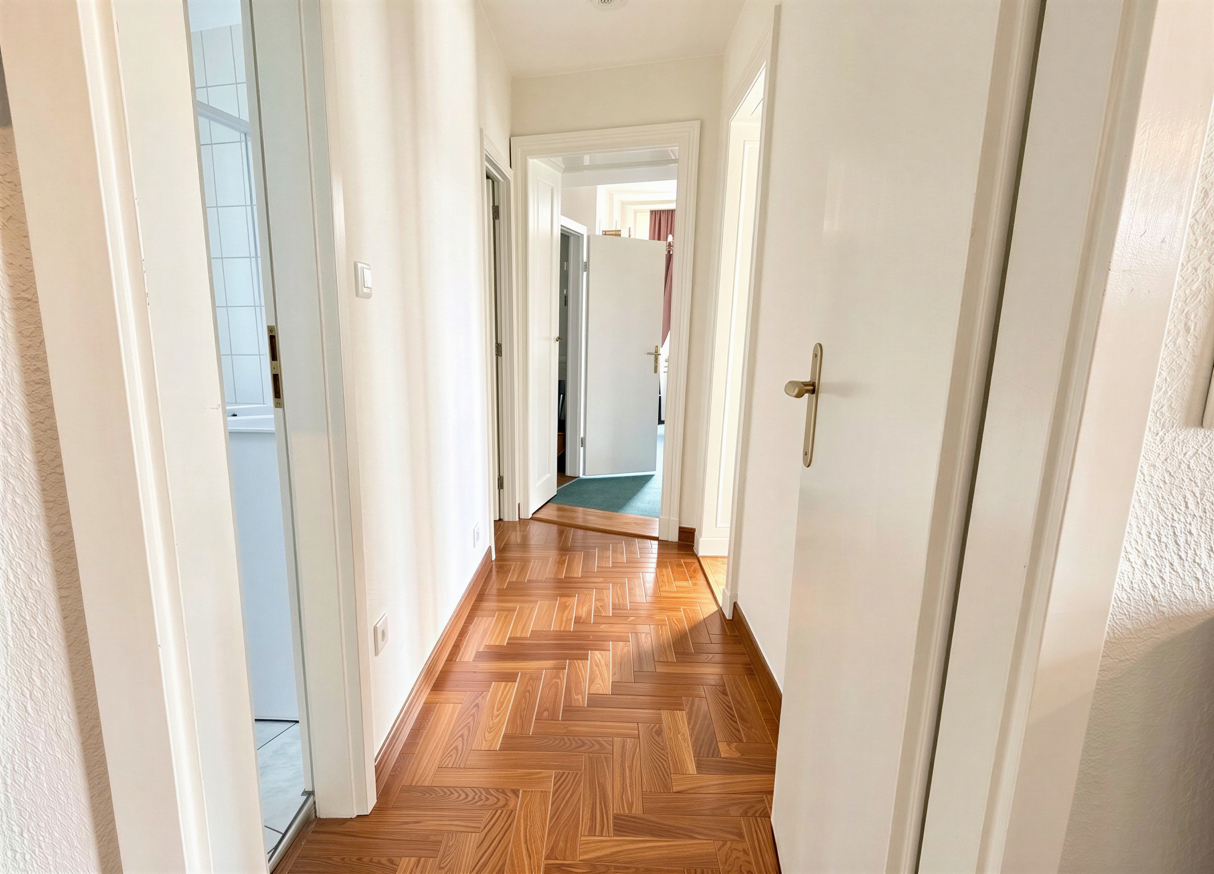 Zwischen dem Schlafzimmer und dem Wohnzimmer befindet sich, hinter einer Verkleidung verborgen, noch die originale Altbau-Flügeltür. Diese bietet die Möglichkeit, den klassischen Charakter der Wohnung wieder stärker herauszuarbeiten und die Räume bei Bedarf offen miteinander zu verbinden.