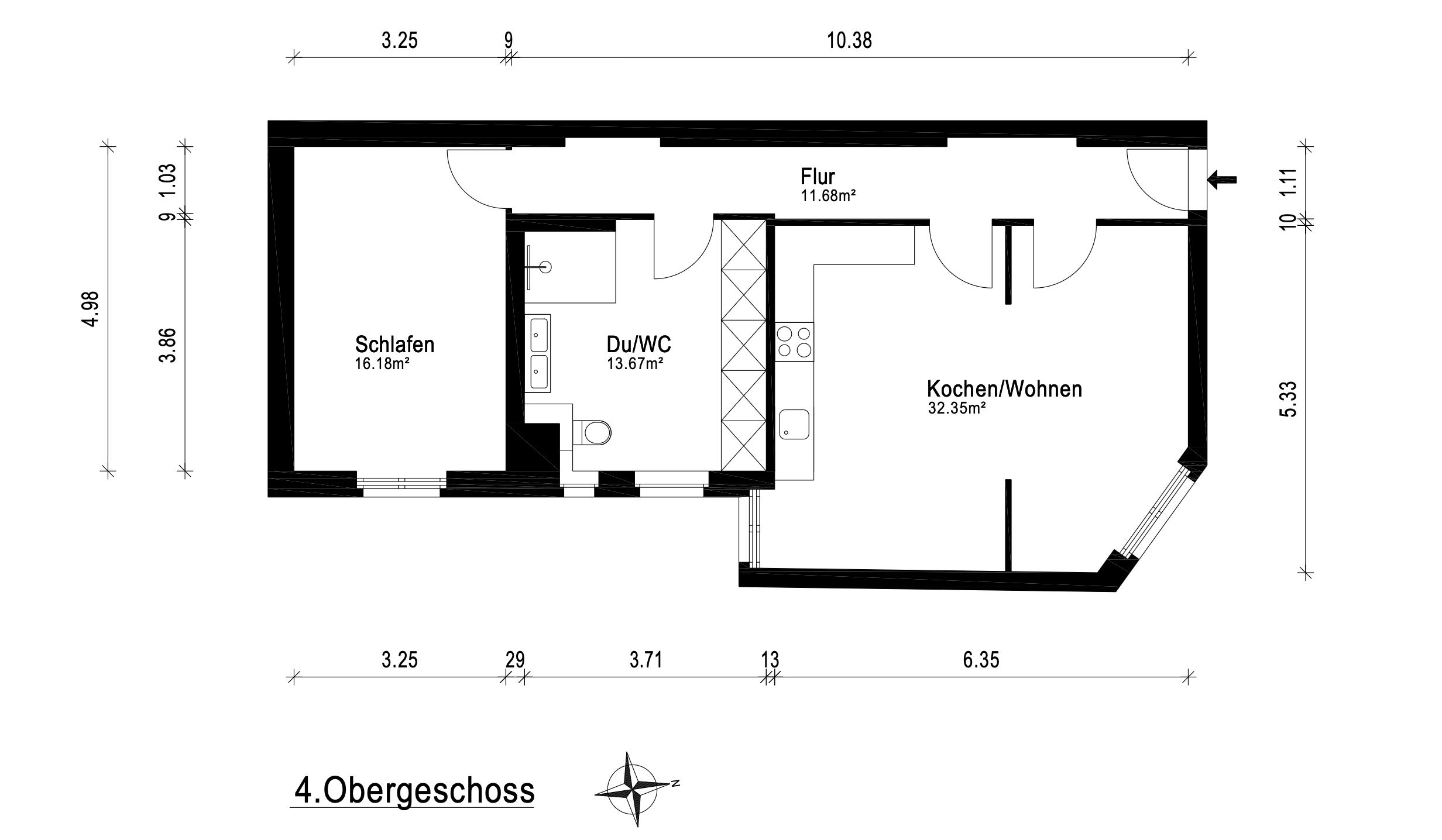 Der Grundriss überzeugt durch klare Struktur und Großzügigkeit. Ein weitläufiger Flur öffnet in den rund 32 Quadratmeter großen Wohn-, Ess- und Kochbereich, dessen fließende Raumwirkung und exklusive Ausstattung ein zeitloses Wohngefühl schaffen. Die moderne, maßgefertigte Einbauküche fügt sich perfekt in das ästhetische Gesamtkonzept ein. Das etwa 16 Quadratmeter große Schlafzimmer bietet eine ruhige, helle Rückzugsmöglichkeit. Das geschmackvoll gestaltete Badezimmer überzeugt mit klarer Formensprache und hochwertigen Armaturen. Ein praktischer Abstellraum erweitert das Nutzungsangebot.