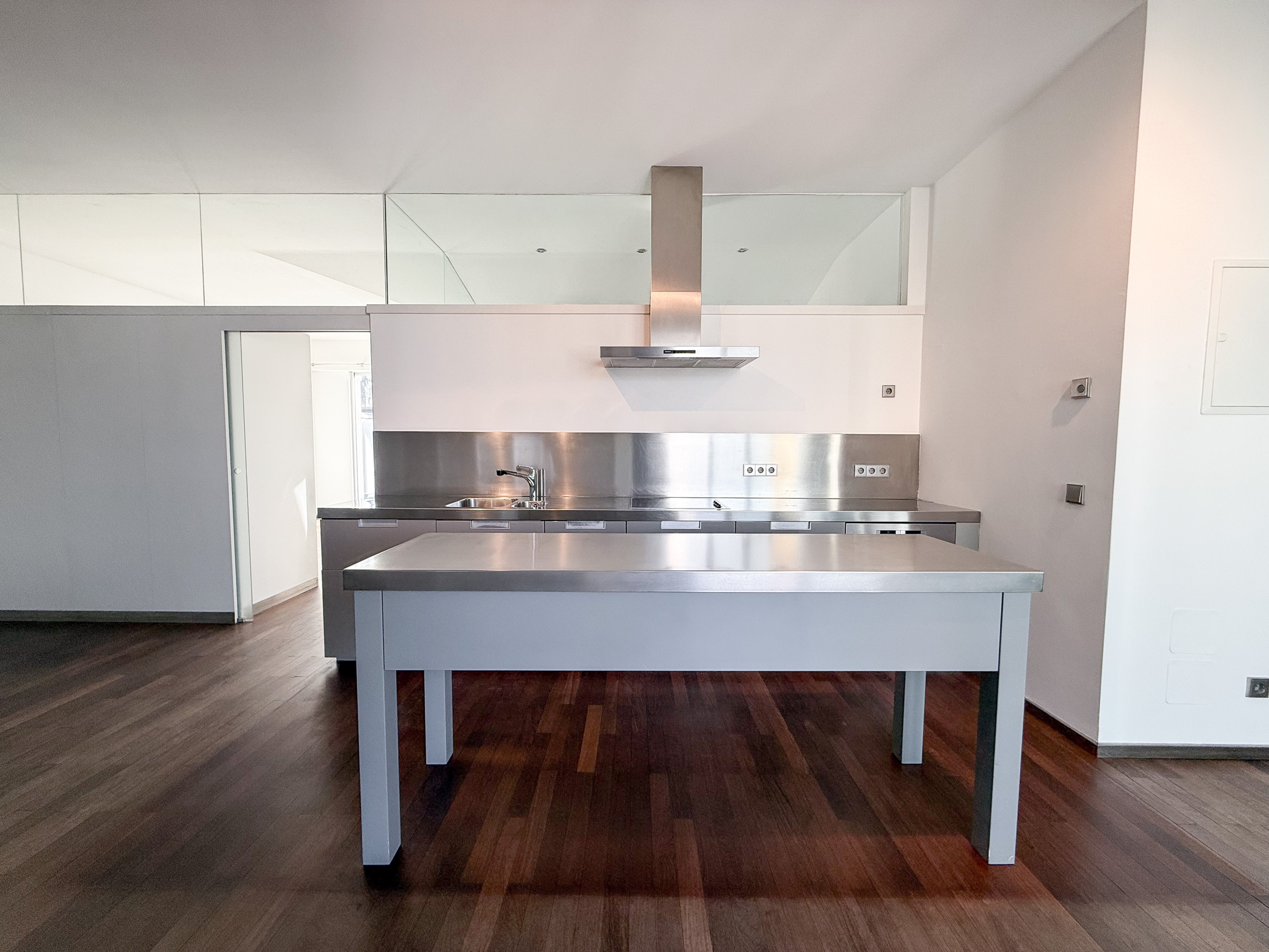 Der weitläufige Wohn-, Koch- und Essbereich bildet das Herzstück der Einheit. Großzügige Fensterflächen, klare Linien und hochwertiges Parkett schaffen eine offene, repräsentative Atmosphäre mit eindrucksvoller Raumwirkung. Die hochwertige Einbauküche fügt sich harmonisch in das architektonische Gesamtbild ein und verbindet Funktionalität mit zeitgemäßem Design.