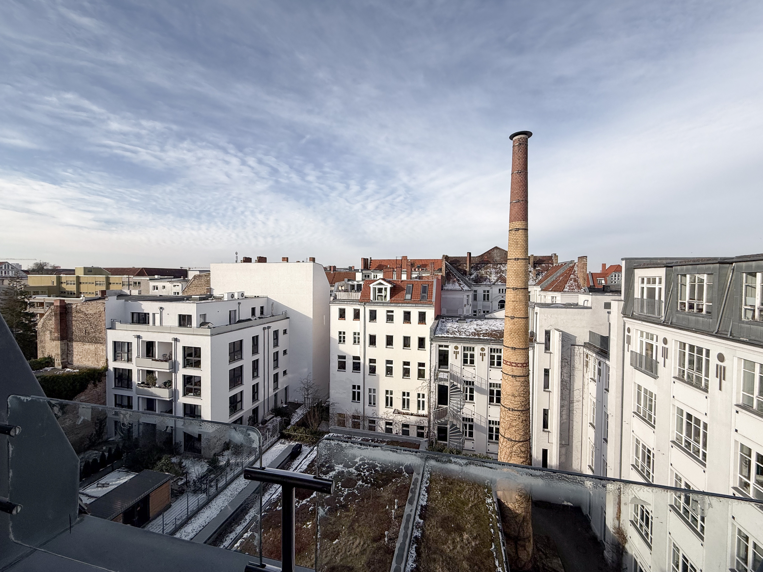 Ein besonderes Highlight bilden die drei Außenbereiche mit einer Gesamtfläche von ca. 26,85 m²: zwei Loggien in Westausrichtung sowie eine großzügige Dachterrasse nach Süden. Von hier eröffnen sich weite Ausblicke über die umliegende Bebauung bis hin zum Funkturm. Die Außenflächen erweitern den Wohnraum auf elegante Weise und schaffen eine seltene Verbindung aus Sonne, Weitblick und Privatsphäre.