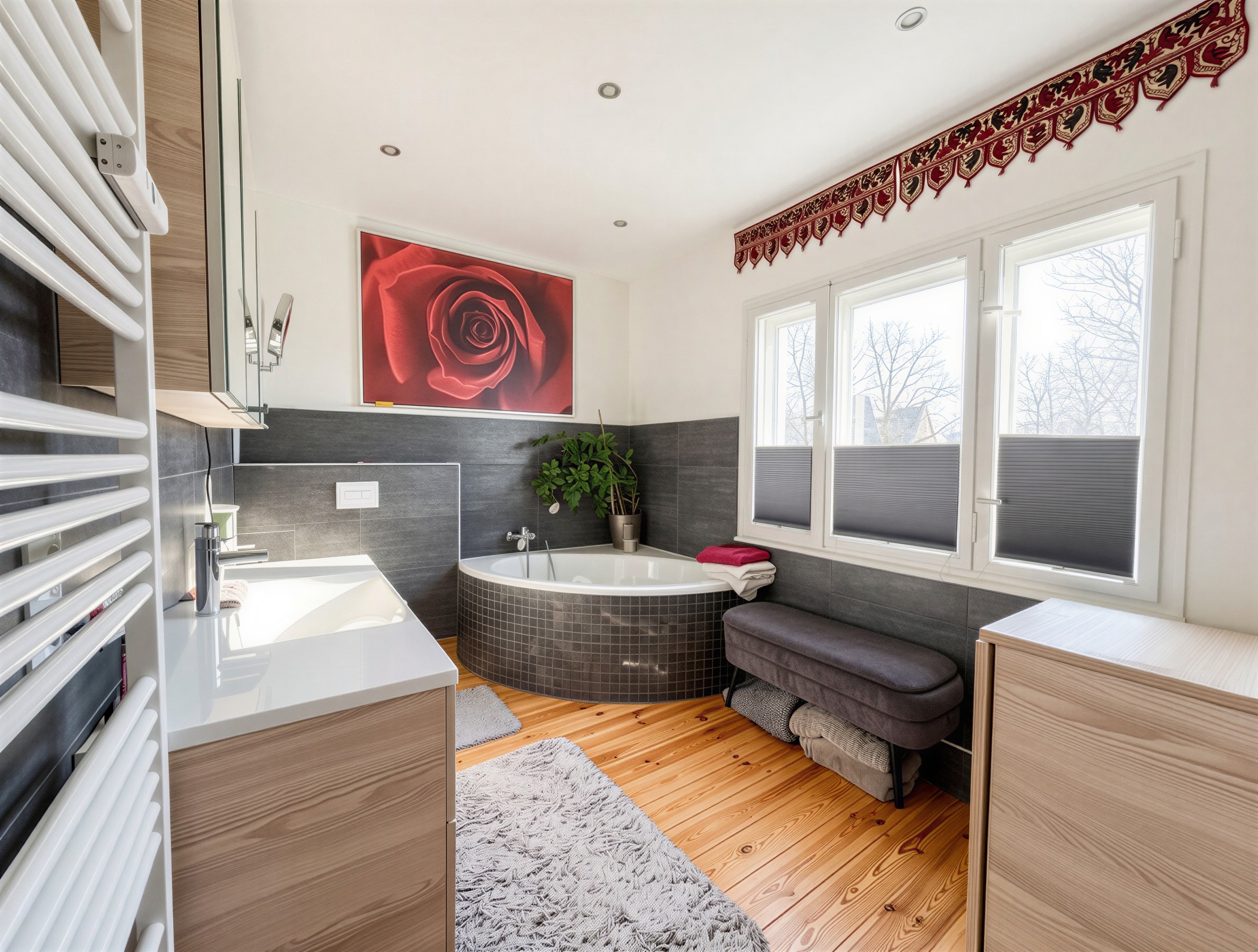 Ein besonderes Highlight der Wohnung ist das großzügige Tageslichtbad. Durch die großen Fensterflächen nach Süden wirkt der Raum besonders hell und freundlich. Die Ausstattung mit Eckbadewanne und separater Dusche sorgt für hohen Komfort und unterstreicht den hochwertigen Eindruck.
