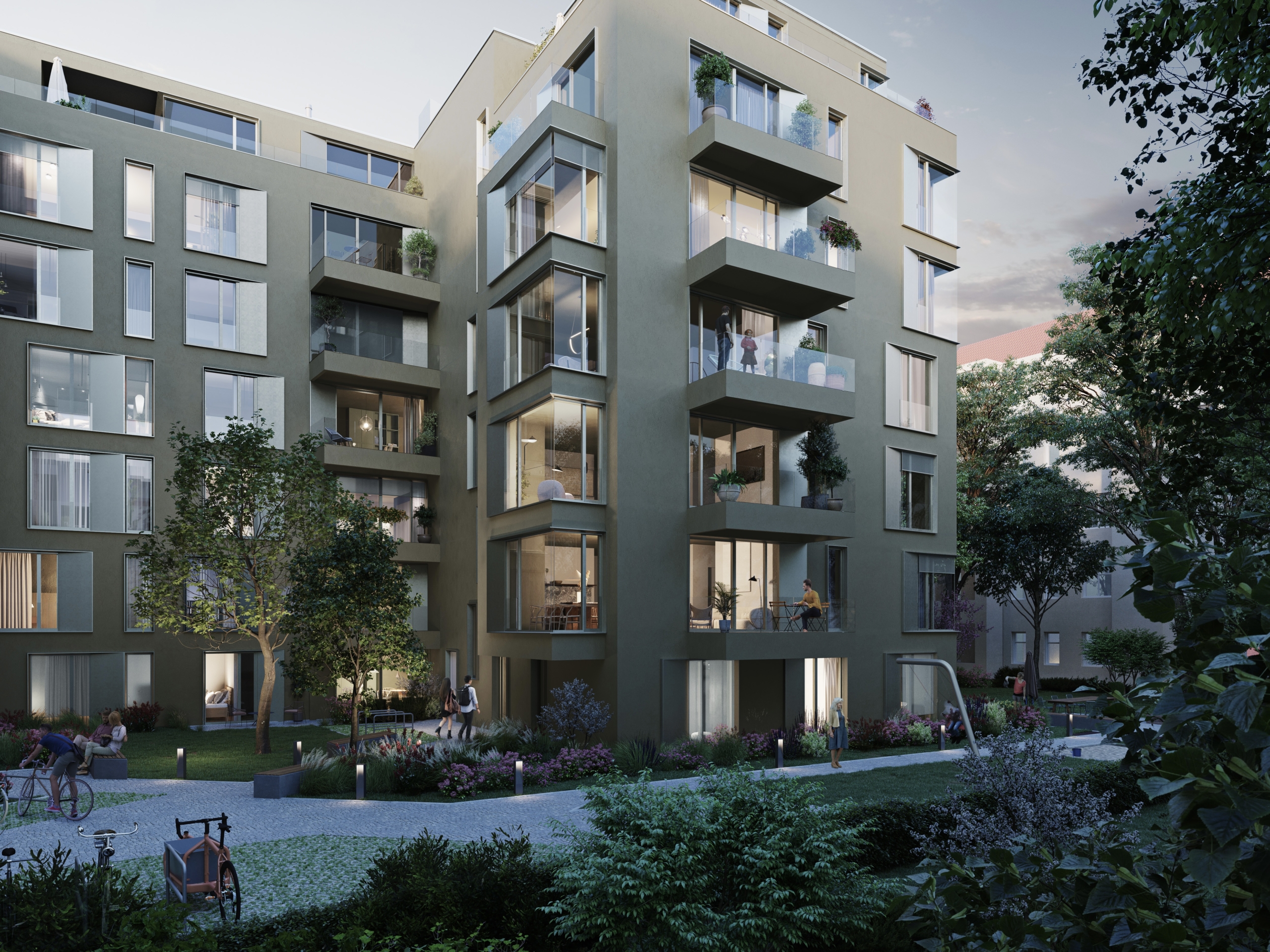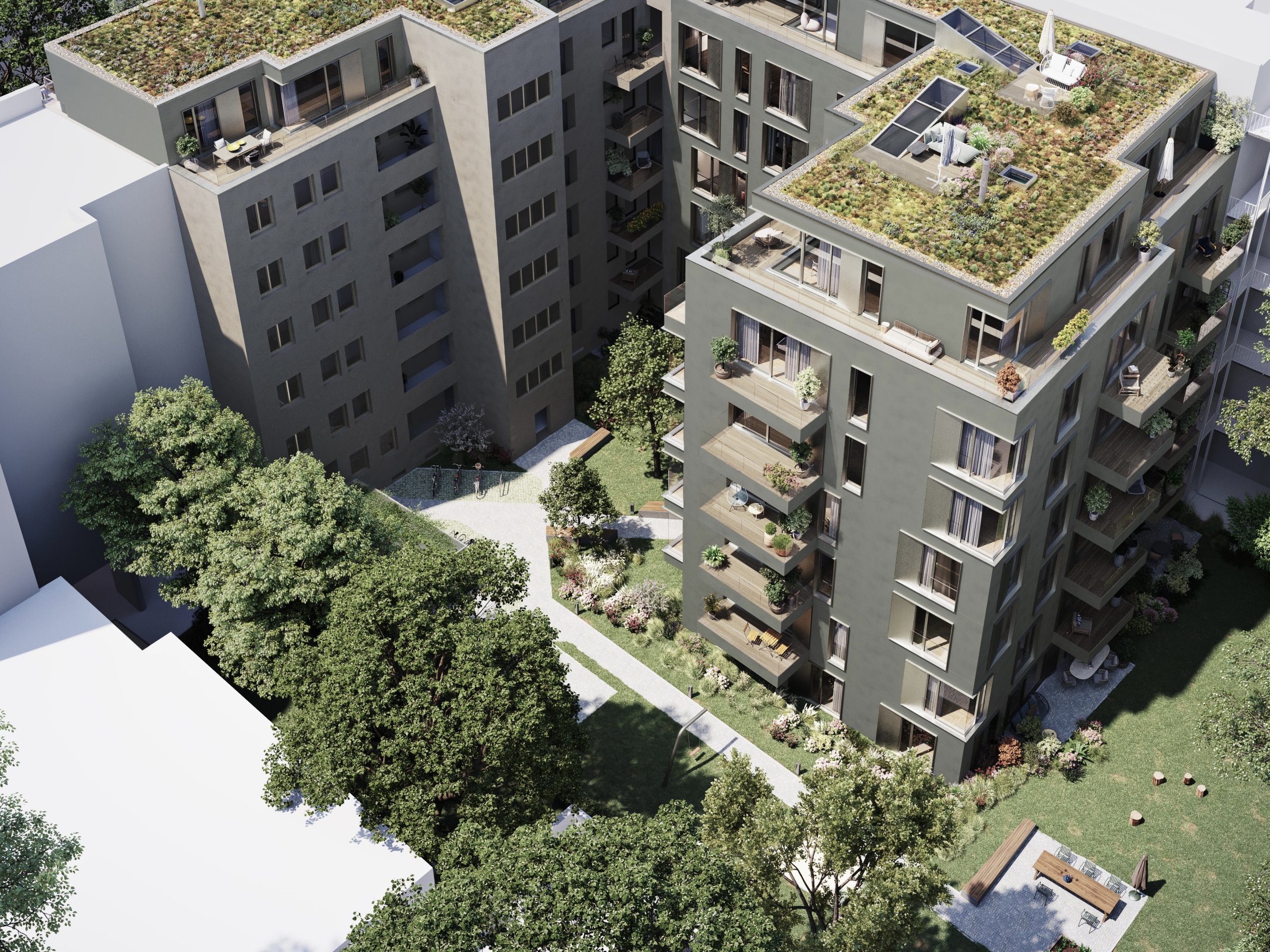 Im Gartenbereich des Grundstücks entstand ein moderner Neubau, dessen Fertigstellung sich derzeit in den letzten Zügen befindet. In diesem Zuge wurde auch das Dach des Vorderhauses um ein zusätzliches Staffelgeschoss erweitert und vollständig erneuert. Vorderhaus und Neubau bilden heute ein harmonisches Ensemble, das durch einen neu gestalteten Innenhof miteinander verbunden ist und eine ruhige, stimmige Gesamtwirkung entfaltet.