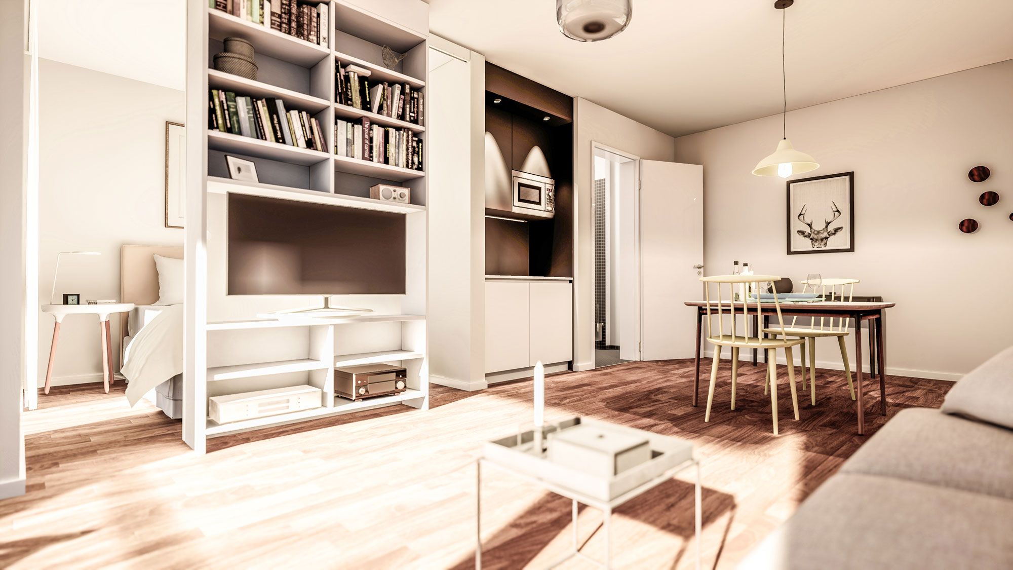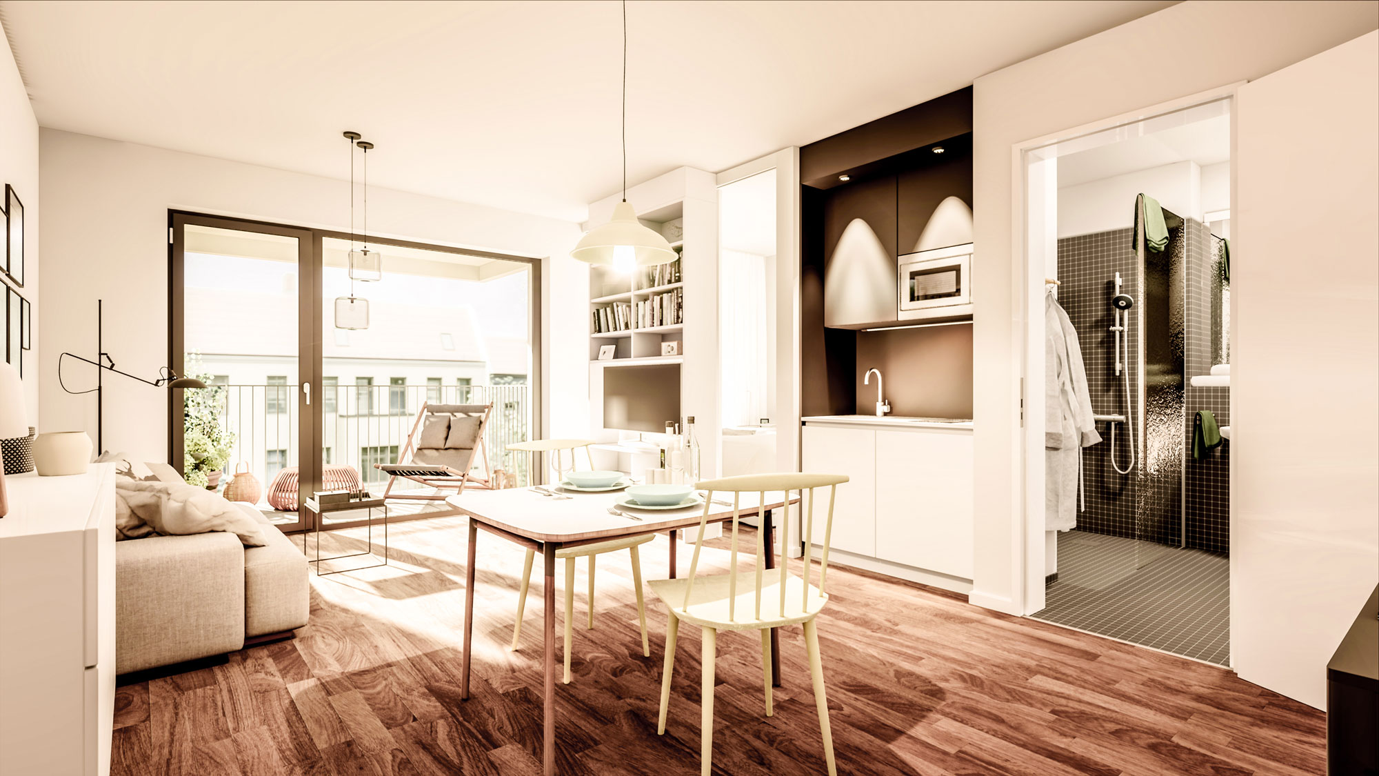 Die Apartments sind so gestaltet, dass jeder Quadratmeter optimal genutzt wird. Mit durchdachten Raumlösungen bieten sie eine hohe Funktionalität auf kompakter Fläche, ohne dabei auf Stil und Komfort zu verzichten. Diese Eigenschaften machen die Wohnungen ideal für ein urbanes Leben, das sowohl Effizienz als auch Ästhetik schätzt.